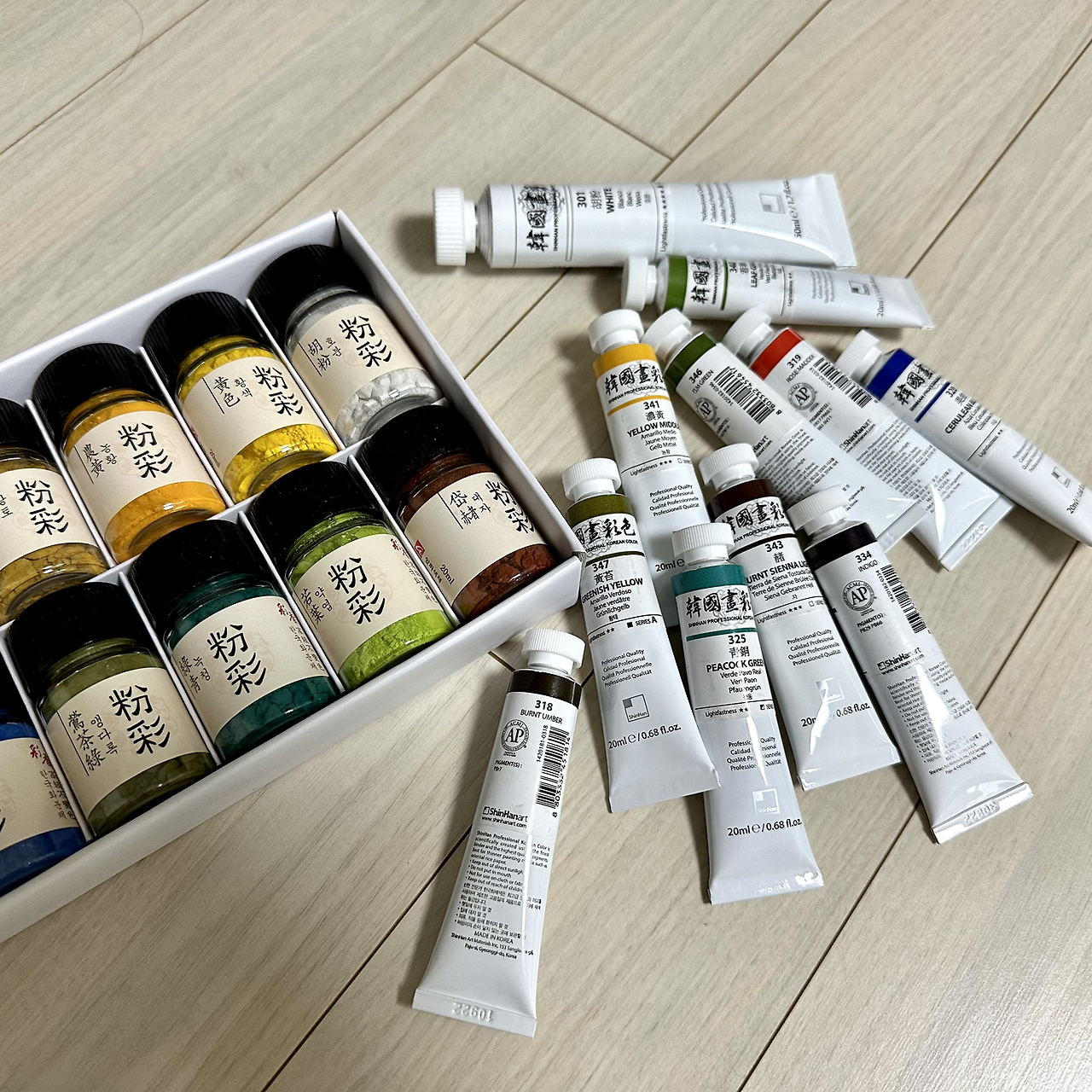 민화 그림 초보에게 최소 도구들만 알려주셨다. 나뿐만이 아니라 화실을 처음 찾는 분들이 얼마동안 배울지 알 수 없기 때문이다. 물감 종류도 다양한데 가장 쉽게 칠하고 무난한 튜브형 물감으로 우리에게 익숙한 모양, 브랜드인 신한 동양화 물감이다. 동양화 물감이 따로 있다는 데 놀랐다. 이 물감을 1년 넘게 사용했다. 재료 부심이 있거나 오래된 회원들은 가루를 물에 녹여서 사용하기도 하고 막대 같은 모양의 물감을 그릇에 갈아서 사용하기도 하는 모습에 궁금했지만 난 전문가 마인드가 아니니까 물어보지 않았다.