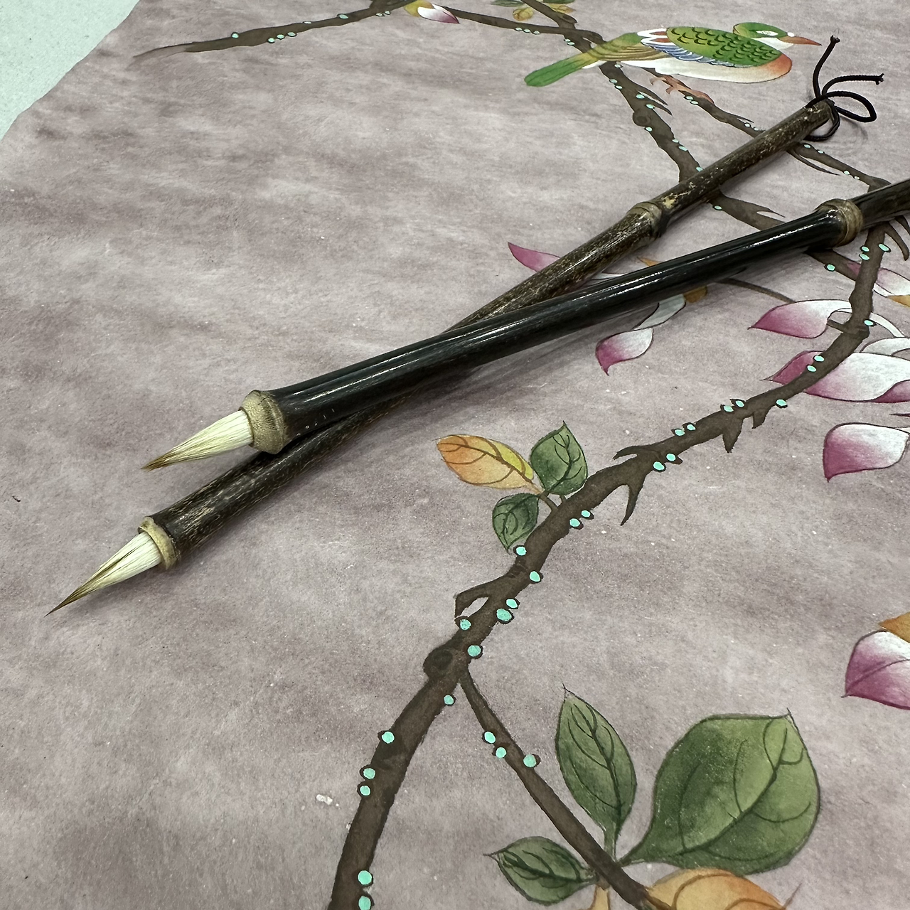 물감, 한지를 샀으니 다음은 붓이다. 동양화 붓은 서예 할 때 붓과 길이감이 다르다. 세필붓이라고 매우 가는 선을 그릴 때(밑그림이나 선) 사용하는 붓, 채색붓, 바림붓까지 샀다. 바림붓은 색채가 된 물감에 물을 살짝 머금은 상태 붓에서 물을 당겨 쓰듯 색을 끌어와 그러데이션을 만들어 낼 때 쓴다. 채색 붓이 수채화 붓에서 흔히 보는 2, 3호 붓이라면 바림붓은 서예 할 때 쓰는 굵은 부피감이다. 붓은 1월에 인사동에서 처음 사봤다. 물감이나 한지보다 붓이 회사도 많고 종류가 많기 때문에 혼자 가서 막 사기 두려운 품목이다. 선생님이나 회원들과 같이 갔을 때 샀다. 선생님께서 화실로 가끔 많은 붓을 가져올 때가 있다. 회원 중에 붓이 필요하다고 구입 희망하거나 모가 좋은 붓이 있으면 여러 개 가져와서 회원들이 살 수 있도록 해준다. 대나무 몸체를 가진 붓으로 10년 이상 배우신 회원님께서 좋으니까 사라고 해 주셔서 선생님이 가져오신 붓 중에 예쁜 모양으로 2자루 샀다.
