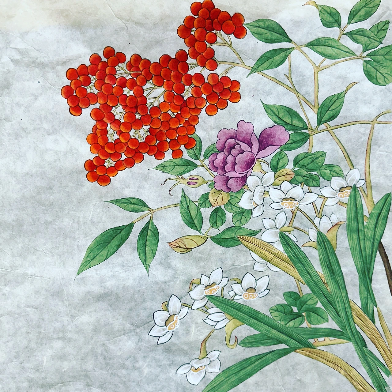 재료가 많고 다양해도 쓸 줄 알아야 하는데, 거기까지 깜냥은 안된다. 연필 모으는 취미(?)가 있어 외국 여행에서 머무르는 호텔에서 가져온 연필, 학회에서 받은 연필을 비롯해 여행 가서 기념으로 사오는 연필, 연필 가게 흑심에서 사 온 고급 연필까지 다양하지만 정작 아까워 모셔둔다. 화실에서도 비슷하다. 여러 종류 물감이 있어도 튜브 물감으로 기본 밑색을 칠한다. 가장 만만하고 편리해서 물감에 손이 가장 많이 간다. 아끼다가 삭아서 못 쓰기 전에 다양하게 쓰는 연습을 해야겠다. 그저께 봉채 만들기 가르쳐 주셨던 선생님이 만든 분채를 또 주문했다. 회사 제품과 수제품의 차이도 궁금하고 같은 빨강이어도 제품에 따라 다를 테니까 그것도 궁금하고.