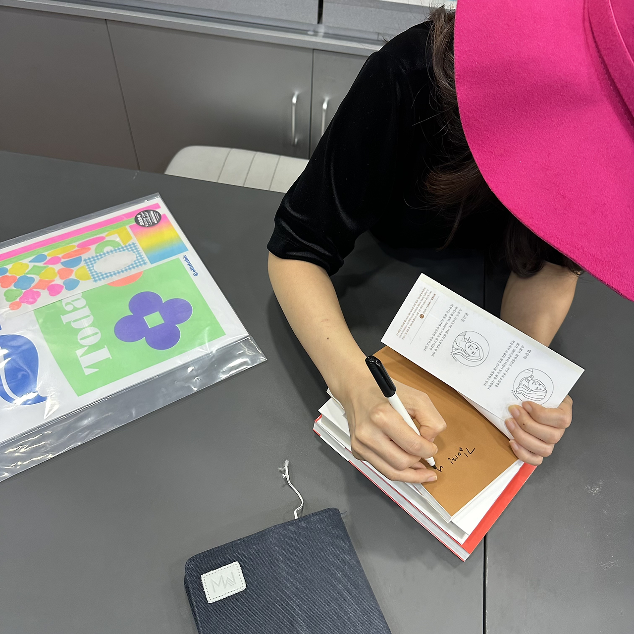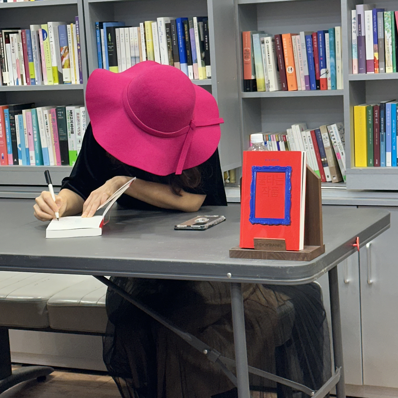 진핑크에 창이 넓은 모자를 쓰고 나타난 작가는 오후 약속에 쓴 모자라 머리가 눌렸기 때문에 벗을 수 없으므로 그대로 북토크를 진행하겠다고 했다. <불타는 작품>으로 염승숙 작가가 사회를 봤고 윤고은 작가가 답을 했다. 북토크가 끝나고 사인회가 있었다. 내 앞에서 사인받는 독자는 윤고은 작가가 기억할 만큼 몇 번의 북토크를 찾아갔나 보다. 얼굴을 보자마자 작가가 알아 봤고 담소를 나눴다. 글쓰기에 관한 얘기였다. 자세히 듣지 못했지만, 아무래도 글 쓰는 고충에 관한 분위기로 보인다.