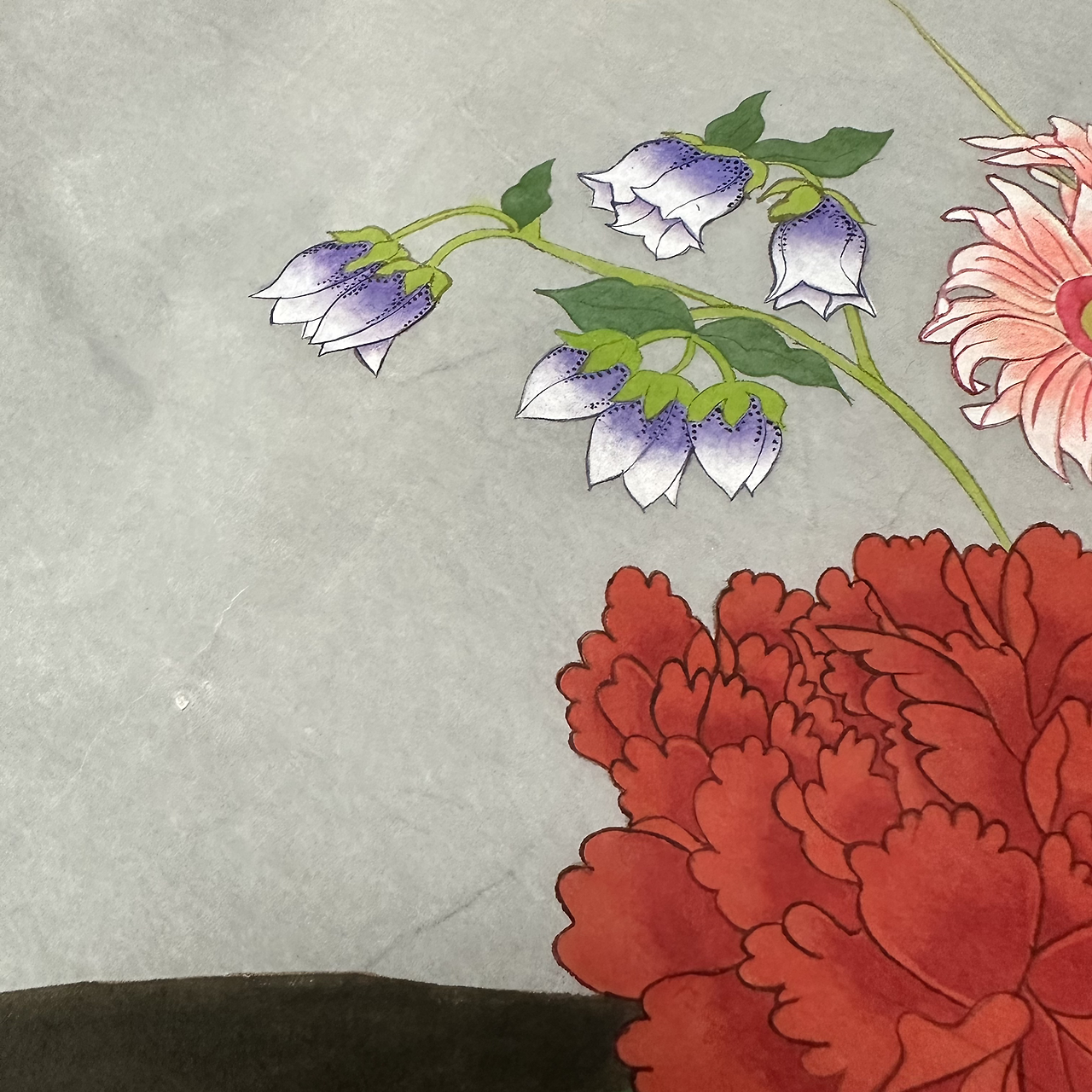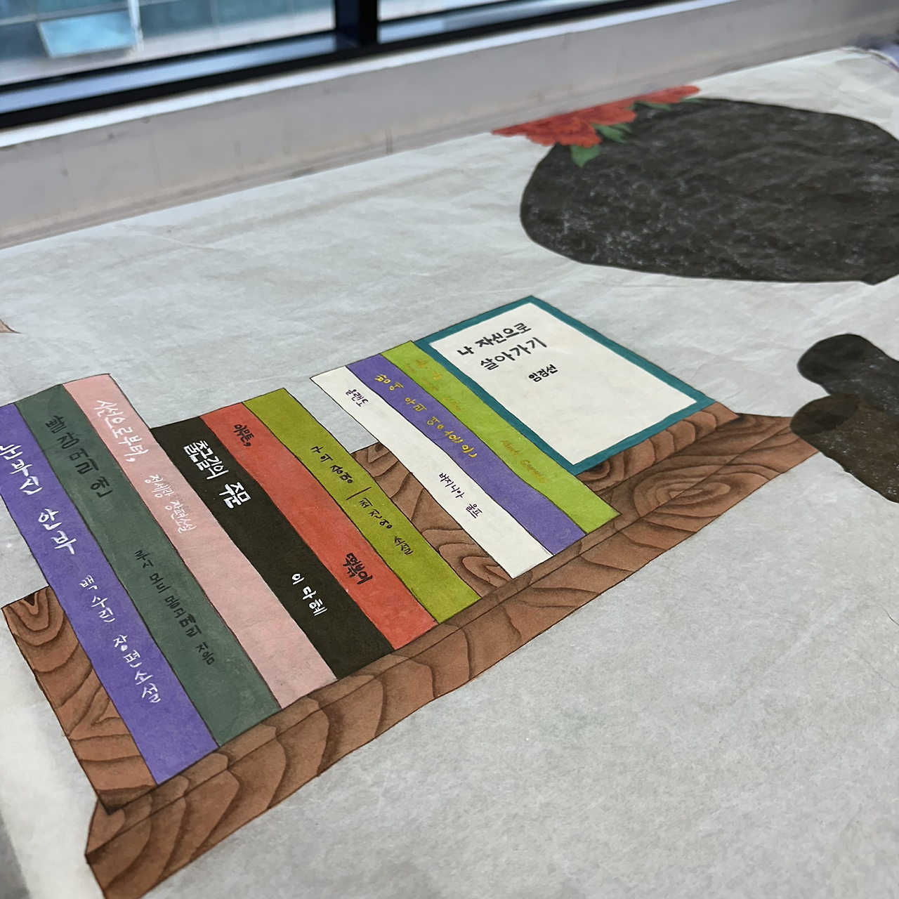 내가 화실에 출근하는 건가 싶기도 하고요. 취미인지 뭔지 모르겠어요. 민화 전문 작가도 아니고 말이에요. 이 길로 갈 것도 아닌데 이렇게 하는 게 맞나 생각하죠. 뭐 하는 건지 모르겠어요. 표구 비용도 만만치 않고요. 이번에 사이즈 정말 크거든요. 전지 사이즈 정도 되는데 가로 폭이 넓어서 더 크게 보여요(머쓱하게 웃기).”