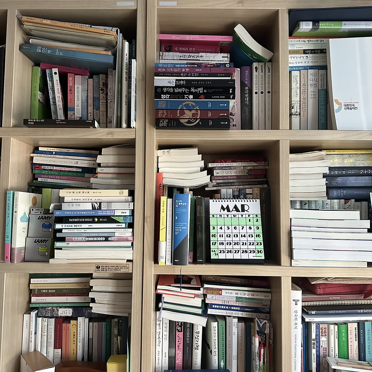 평일은 일어나자마자 아침 준비하기 바쁘지만 주말이면 빈둥거리며 누워 있는 방. 눈은 자연스레 책장으로 간다. 책장에만 책이 있지 않고 보이지 않지만 바닥(도서관에 나눔 할)에도 침대 위 어린이 밥상? 책상?(토마스 책상) 위에도 화장대 의자 위에도 넘치도록 책이 있다. 조만간 청소년 아버지가 책 좀 어떻게 하라고 할 것 같은 불길한 예감. 아님 포기했을지도. 우리 집 청소기 담당은 청소년 아버지라 최소한 바닥에 나뒹굴게 하면 안 되니까.
