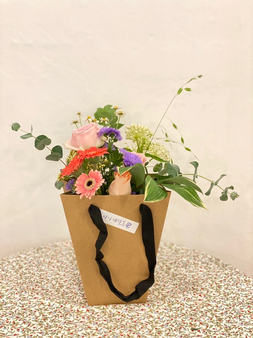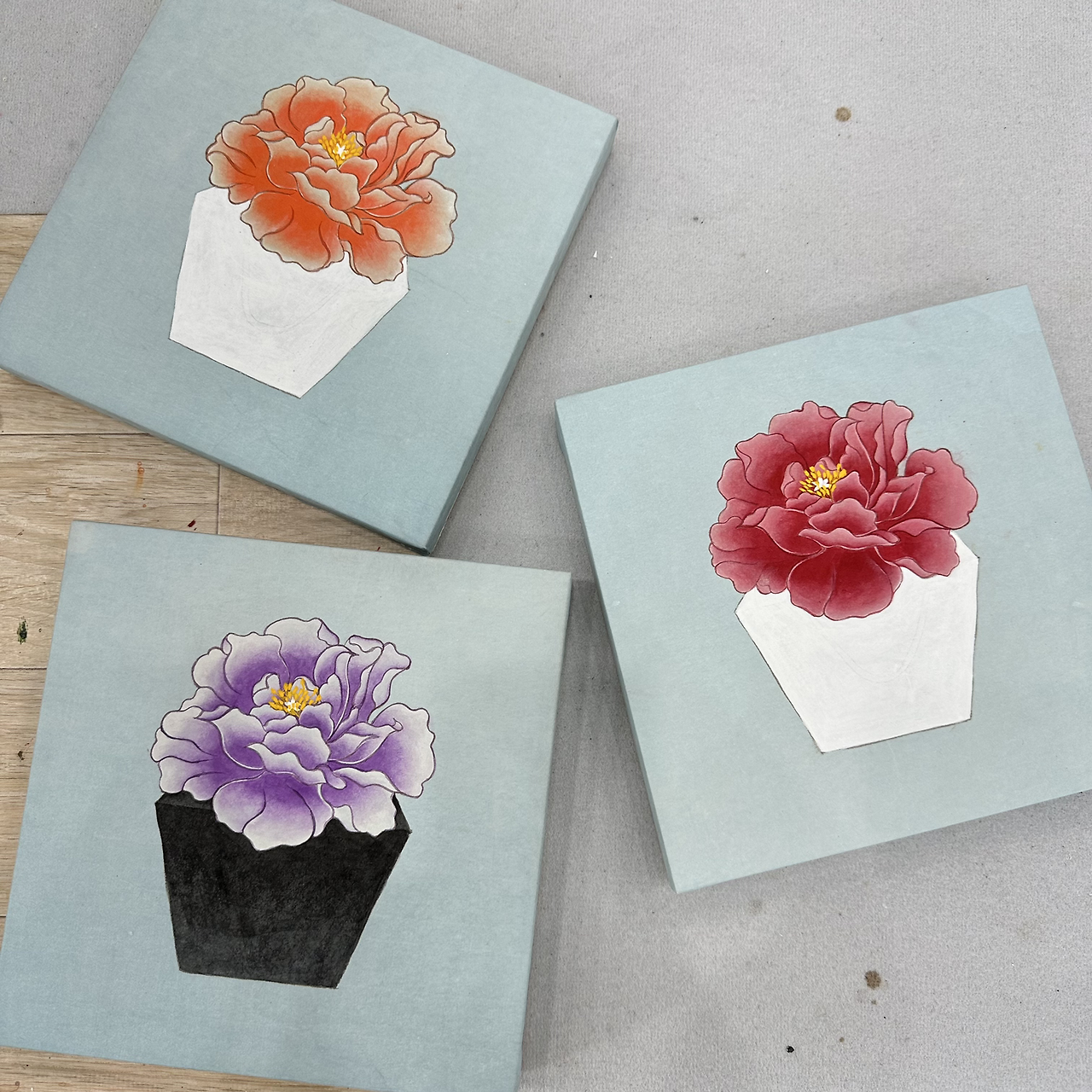 아트페어는 박람회다. 즉, 나를 홍보하는 자리다. 나는 이런 그림을 그리는 사람이고 내가 그린 작품을 보여주며 판매까지 이루어지면 더할 나위 없다. 첫 참가자는 애석하게도 박람회를 몰랐다. 선생님께서 단순한 그림을 그렸으면 좋겠다고 하셨고, 기한도 빠듯했다. 한 송이 모란이 중심으로 놓을 수 있는 그림은 무엇인지, 크기는 어느 정도 되어야 하는지. 핸드폰을 뒤적여 봤다. 모란은 ‘부귀영화’를 의미하니까 누군가에게 모란 한 송이를 받는다면 주는 사람의 마음에 감탄할 거라고 상상한다. 나의 부귀영화를 바라는 마음을 받다니. 모란 한 송이에 이런 장면으로 연결되다니. 생각이 많긴 하다. 상상력이 풍부함과 조금 다른 결인데 꼬리에 꼬리를 무는 것을 즐겨한다. 모란 한 송이를 선물과 연결시키니 꽃집에서 꽃을 사고 넣어주는 종이 상자가 생각난다. 선물은 자고로 정성이니까. 타인의 부귀영화를 바라는 마음이라면 더더욱 정성스럽겠지.