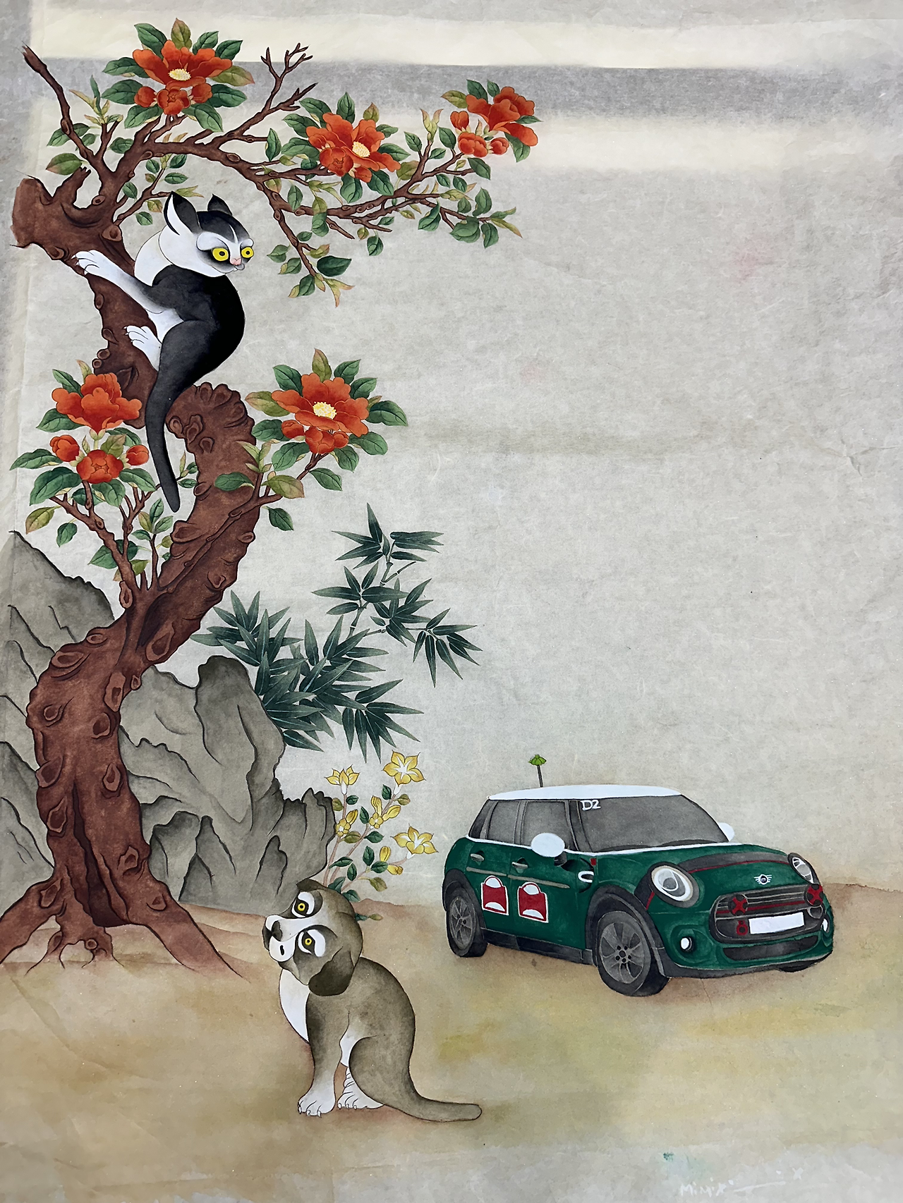 이것도 저것도 마음에 들지 않을 때는 나의 시선으로는 콜라보, 청소년 시선의 커스터마이징 하기로 했다. 민화 도안을 뒤적뒤적한다. 유유자적 나무 아래 한가롭게 쉬는 모양이면 좋겠다. 자동차가 들어가기 적당한 배치여야 한다. 며칠 동안 도안을 찾아 헤맸다. 화실에 간 날. 선생님께 몇 개 도안과 자동차를 보여주고 최종 합격(?)한 화조묘구도 도안을 주문했다. 본격적으로 그리기 시작. 패드 효과를 이번만큼 톡톡히 봤다. 친구가 보내온 자동차 사진에 밑그림을 따고 프린트했다. 선생님과 의논할 때 자동차 크기를 물어봤다. 주문한 도안의 크기를 감안하고 배치시켜 최종 내가 그릴 그림의 크기를 가늠했다. 또다시 나의 여정은 시작되었다. 밑그림까지 다 따고 나니 선생님께서,