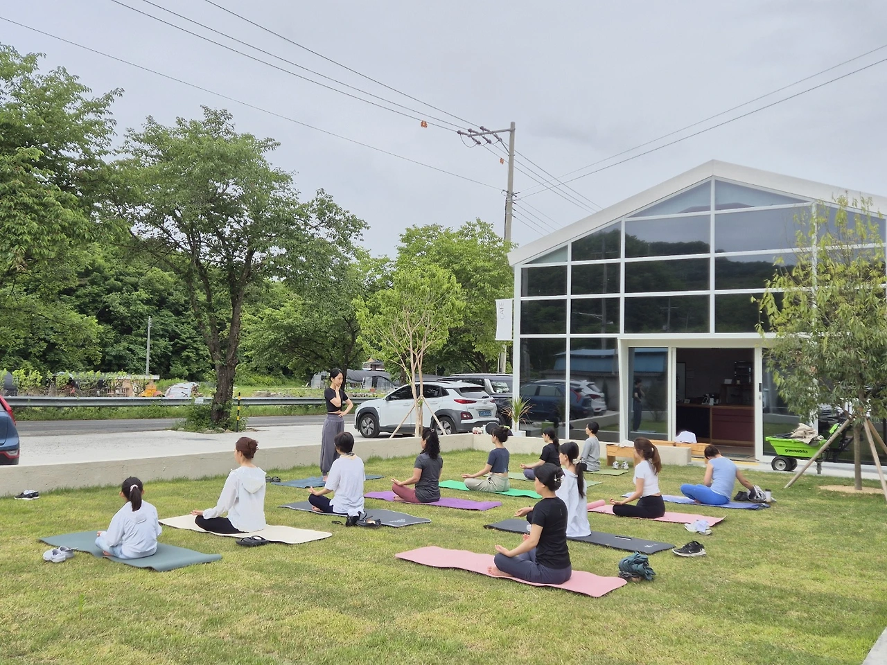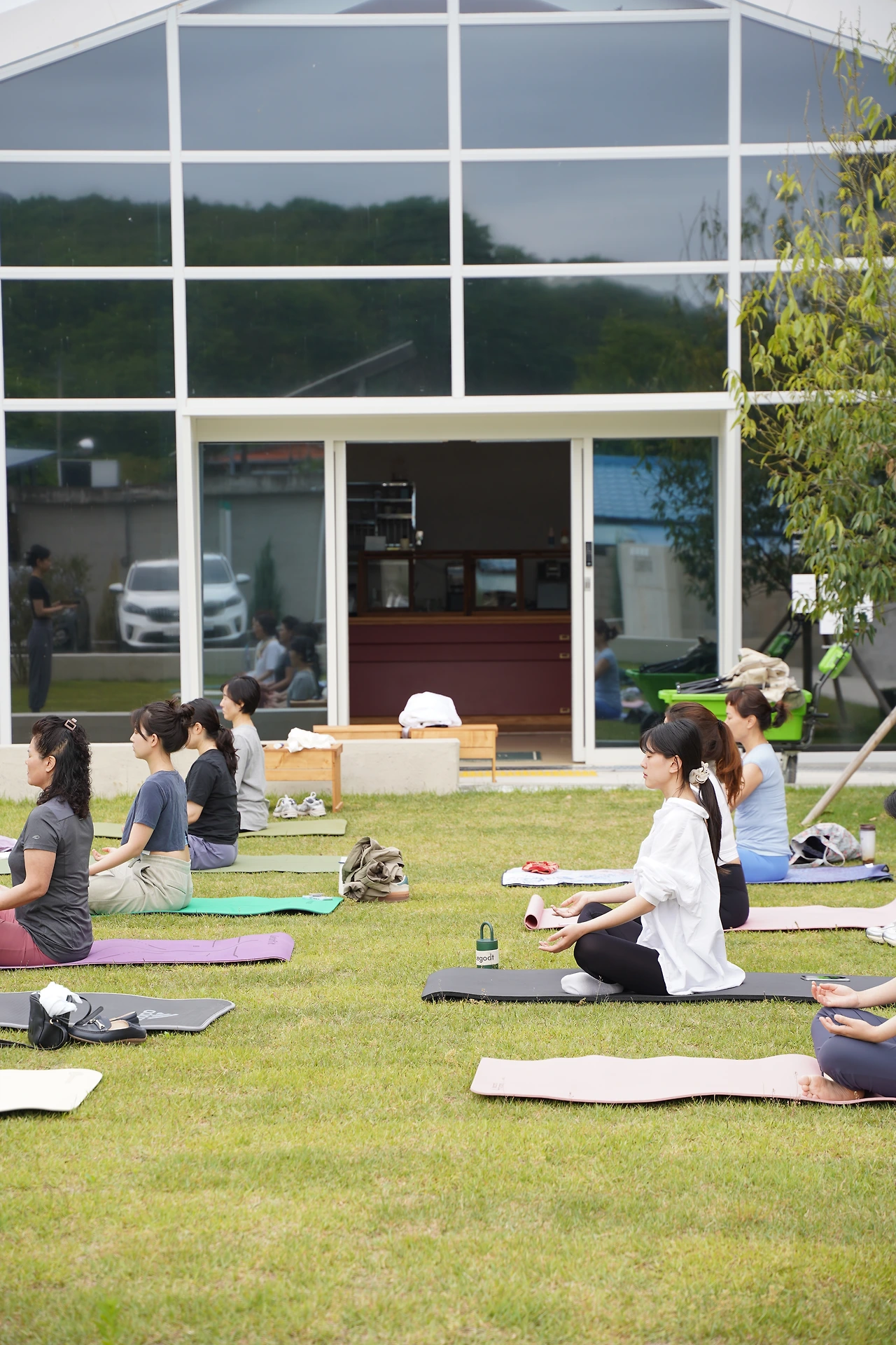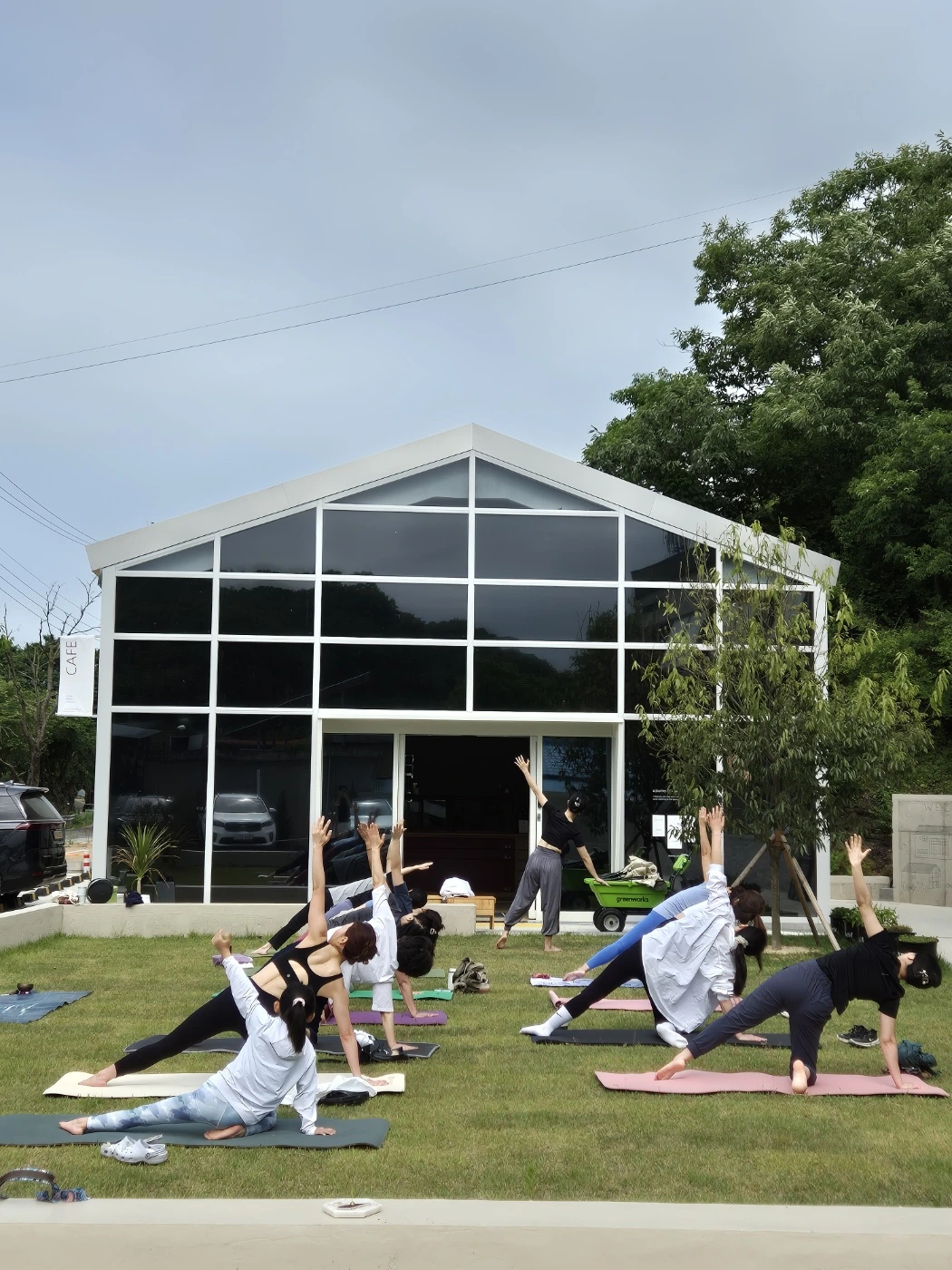 우리가 수련한 곳은 의성에 위치한 <구계밀리> 카페다. 정미소로 운영되던 이곳은 마을에서 유일하게 밀을 빻았던 공간이라고 했다. 정미소에서 사용하던 장비를 재활용해 의자가 되었고, 마당에 있었을 법한 ‘배롱나무’를 그대로 두고 카페 공간을 만들었다. 잔디를 깔아 야외 의자를 놓아둔 마당에서 수련했다. 주말 카페 오픈이 10시 반이라 9시부터 10시까지 수련하고 야외 의자와 테이블을 원래 자리로 돌려놓는다.