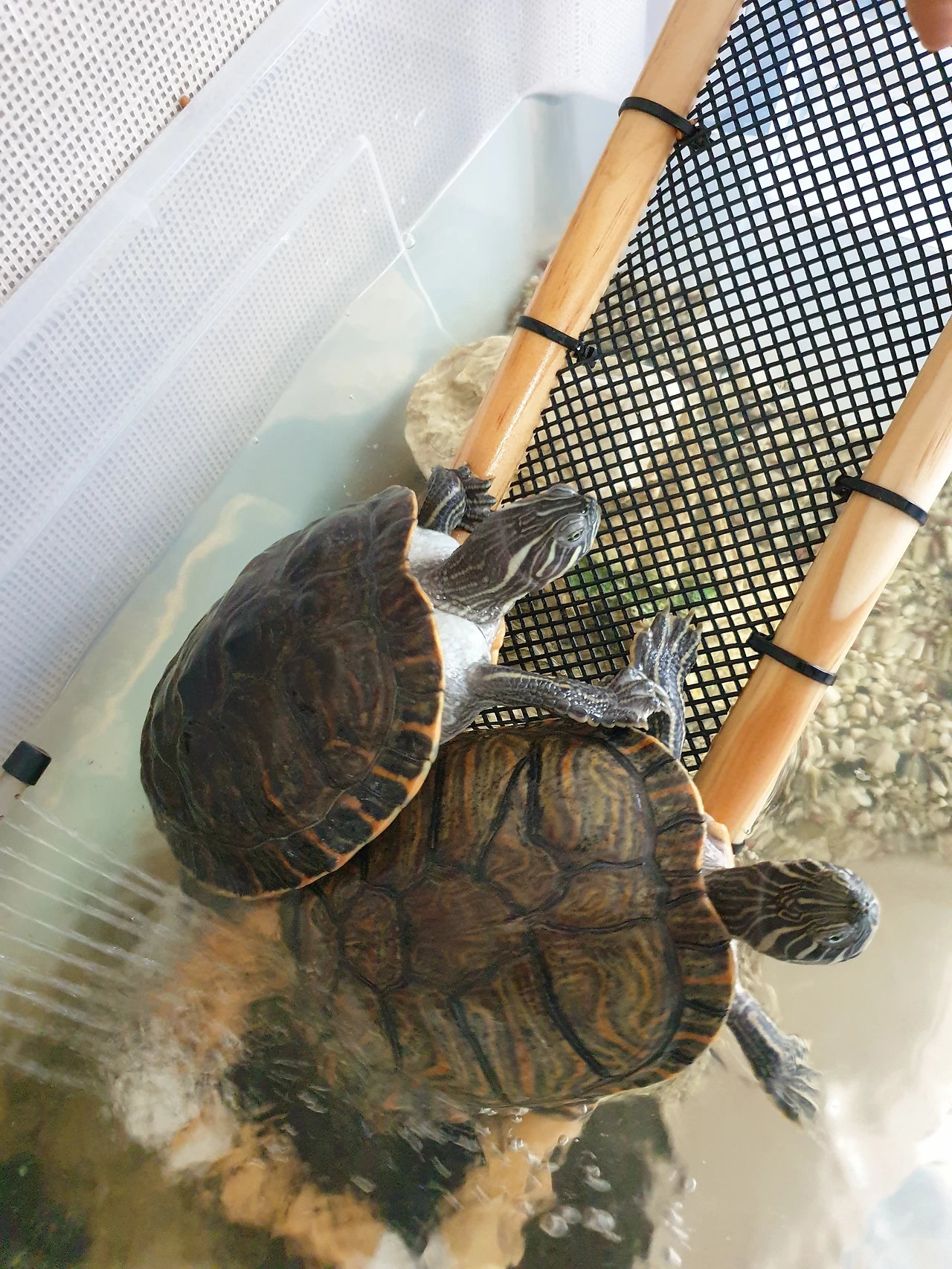 우리는 지금 거북이 얘기를 자주 하면서 미안함을 마주하고 있고, 남은 거북이를 더 자주 들여다보면서 행동이 달라졌는지 유심해 본다. 거북이 두 마리가 있을 때 서로 등에 올라타면서 (교대로 올라탔는지 모르겠지만) 물 밖으로 등을 내밀거나 얼굴을 내밀며 쉬곤 했는데, 이젠 혼자여서 여과기에 올라가 등을 내밀거나 얼굴을 내민다. 아니면 놀이터에 올라가 있다. 혼자인 거북이에게 마음을 더 쓰고 있고 행동을 유심히 관찰하기 때문에 느껴지는 모습인지 모르겠지만, 근처만 가도 달라붙을 듯이 다가오던 거북이가 오긴 오는데, 자꾸 놀이터 밑으로 들어간다. 먹이를 주면 숟가락을 뜯을 듯이 받아먹는데, 한 뼘 떨어져 머리를 내미는 듯이 보인다. 부디 나의 착각이길 바란다.