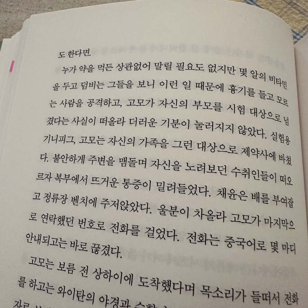 이 책이 상을 탈만하다고 느낀 부분은 중심 사건 하나를 전개하는 방식이 하나였다면 다소 진부 했겠지만, 생각지 못한 부분이 있다. 대기업에서 비밀리에 임상 체험으로 약을 개발하고 있는 와중에 이 약을 빼돌리려는 무리, 약의 부작용이나 정당화되지 않은 방법으로 약을 개발하는 실태를 알리려는 무리 모두가 채윤 주변에 일어남으로써 영화를 보는 것처럼 탄탄하다. 반면 영화의 장면처럼 몇 장면이 생략하고 전개된 속도가 나타나기도 한다. 채윤 고모가 채윤이 배달하는 약을 중국에 빼돌려 카피약을 판매하는 사업에 들어가는 장면에서 책은 불친절하게 한 줄의 내용만으로 설명했기에 나의 이해력을 곱씹으며 몇 번이나 다시 읽었다. 비슷하게 영화였다면 한성태 집에 숨어 있는 주인공 채윤이 현관 비밀번호를 누르는 소리에 겁을 먹은 장면에서 쓰러진 동작은 생략하고 정신이 드냐는 질문으로 장면이 바뀌면서 이야기가 이어질만한 부분이다.