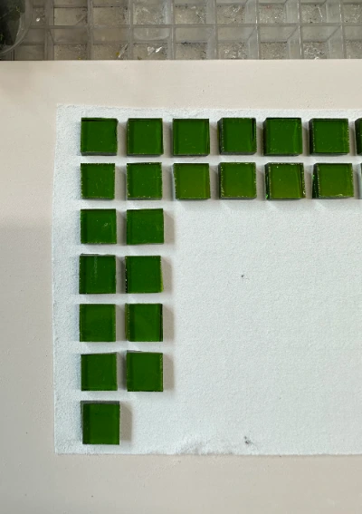 참고로 내화지는 가마에서 소성된 후, 눈에 띄게 그 성질이 변한다. 종이의 형태는 조금 남아 있을지언정 조금만 힘이 들어가도 부서지듯이 찢어진다. 어떻게 묘사해야 정확할까. 찢어지는 형태가 종이의 “주욱”하는 느낌이 아닌 지분거리는 가루처럼 변한다고 해야 하나. 그러니 연필이나 펜으로 표시하기도 어렵다. 보통은 내화지에 얹기만 해도 되는 덩어리 형태의 것을 올려 재활용했는데, 오늘은 요즘 하는 작업을 위해 연필로 점을 찍어 표시하며 사용해 보았다. 내화지의 가루가 유리 조각 위로 하얗게 날리면 호호 불어가며 조심스럽게 이어진 작업.