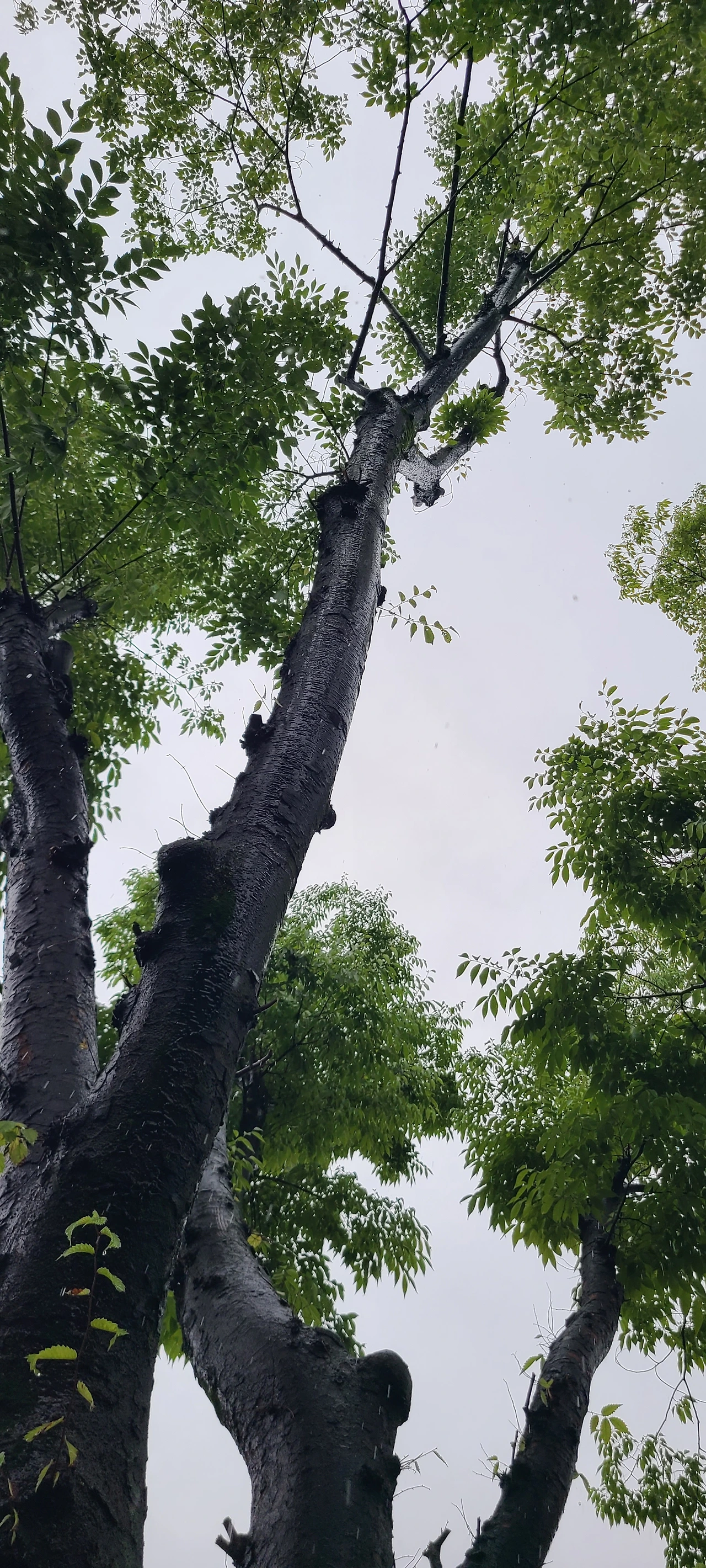 놀이터 나무가 비를 흠뻑 맞고 있다