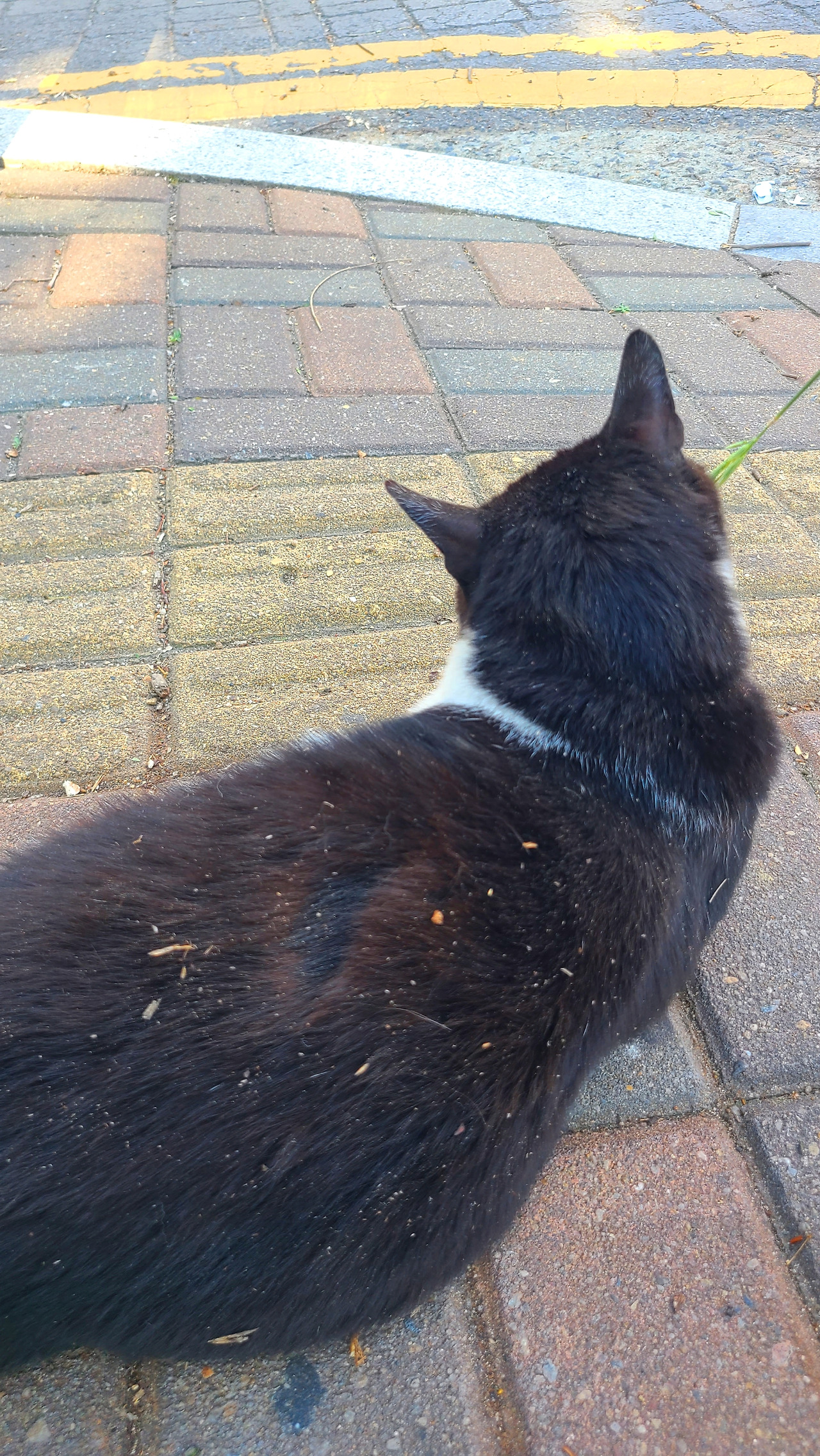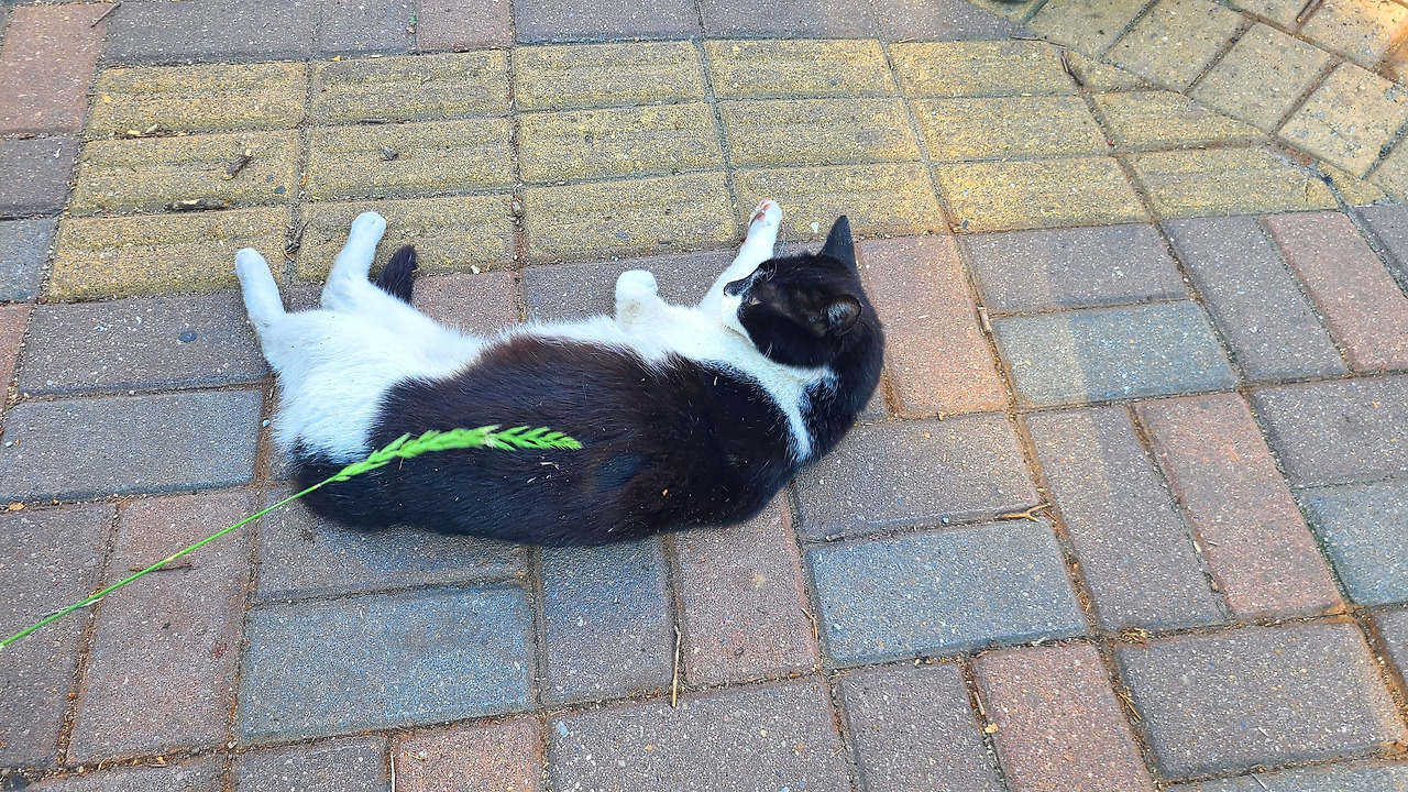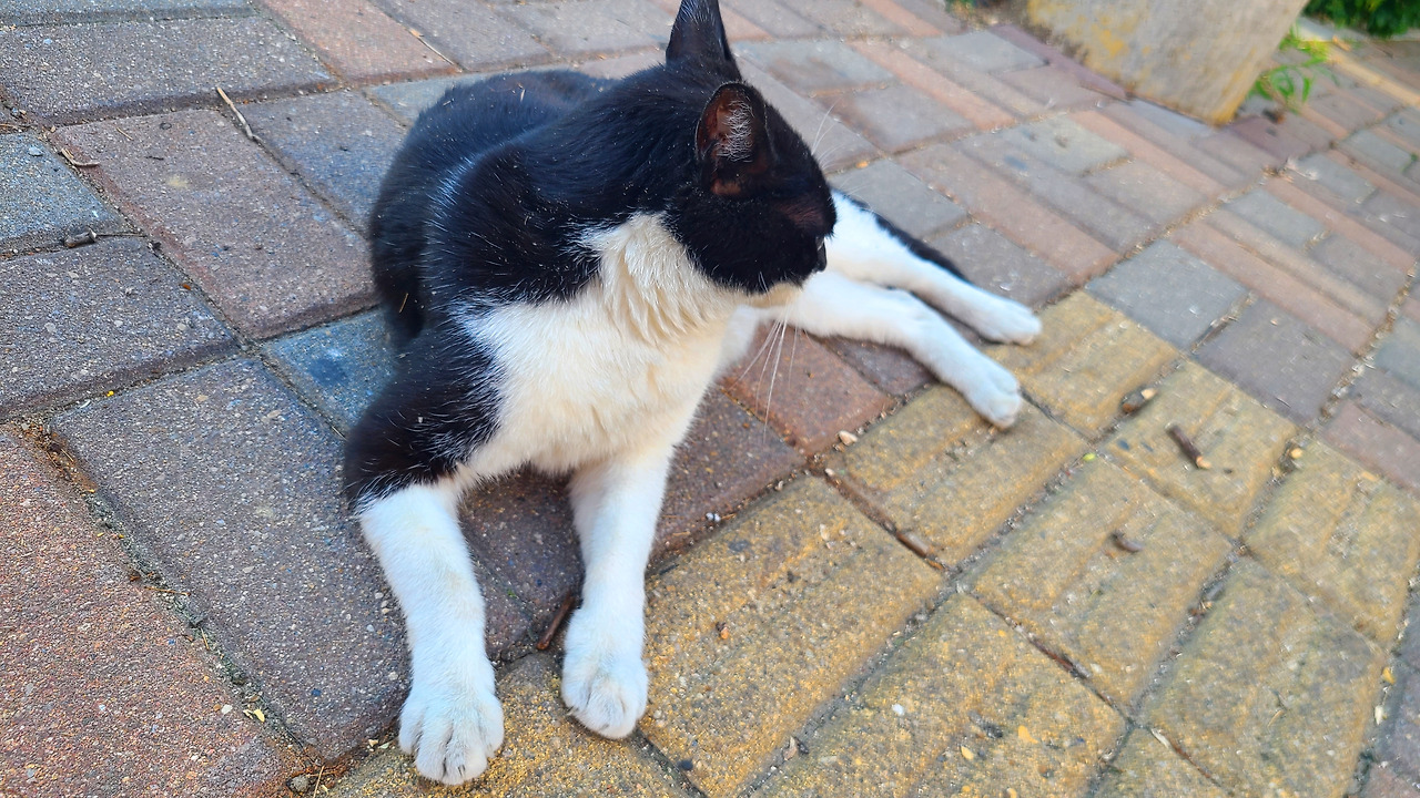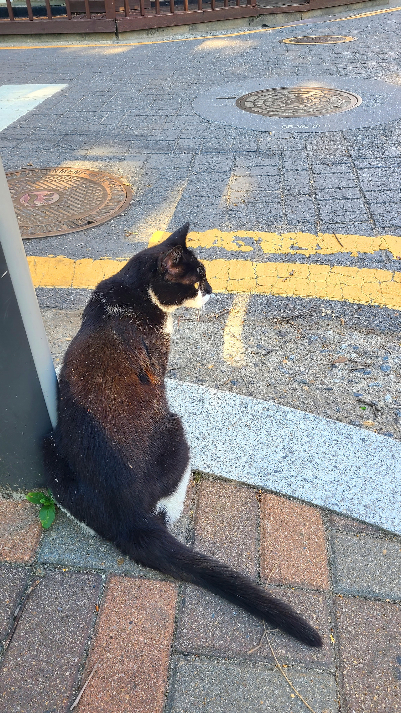 검은색 옷을 입은 듯한 고양이는 바닥에 드러누워 있었다. 누군가가 만졌다가 고양이가 할퀴어서 다쳤다는 이야기가 들렸다.