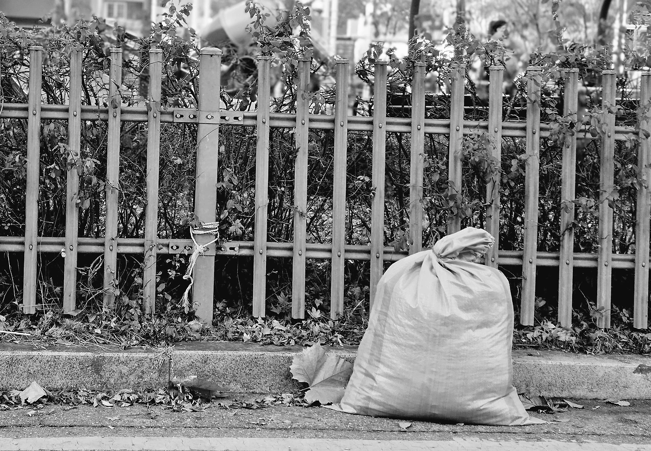떨어진 가을이 포대에 담겨져 있다