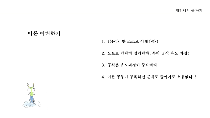 수학 공부할 때는 모든 것에 왜? 이렇지? 하고 의문을 품어야 한다. 풀이과정을 외워서 해결하려고 하면 수학 실력은 늘지 않는다.