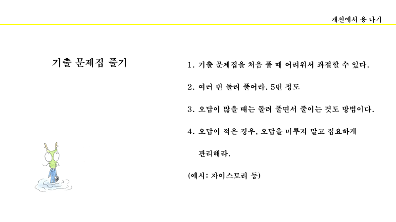 기본서에서 틀리는 문제가 없도록 무한 연습하면서, 문제 유형 문제집과 모의고사 기출문제를 풀면서 수준 높은 문제도 같이 경험한다. 이 경우는 돌려 풀기엔 시간이 부족하므로 틀린 문제만 돌려 풀거나 전체를 1~2번 돌려 푸는 것도 좋다. 물론 주어진 시간에 따라서 결정할 문제이다.