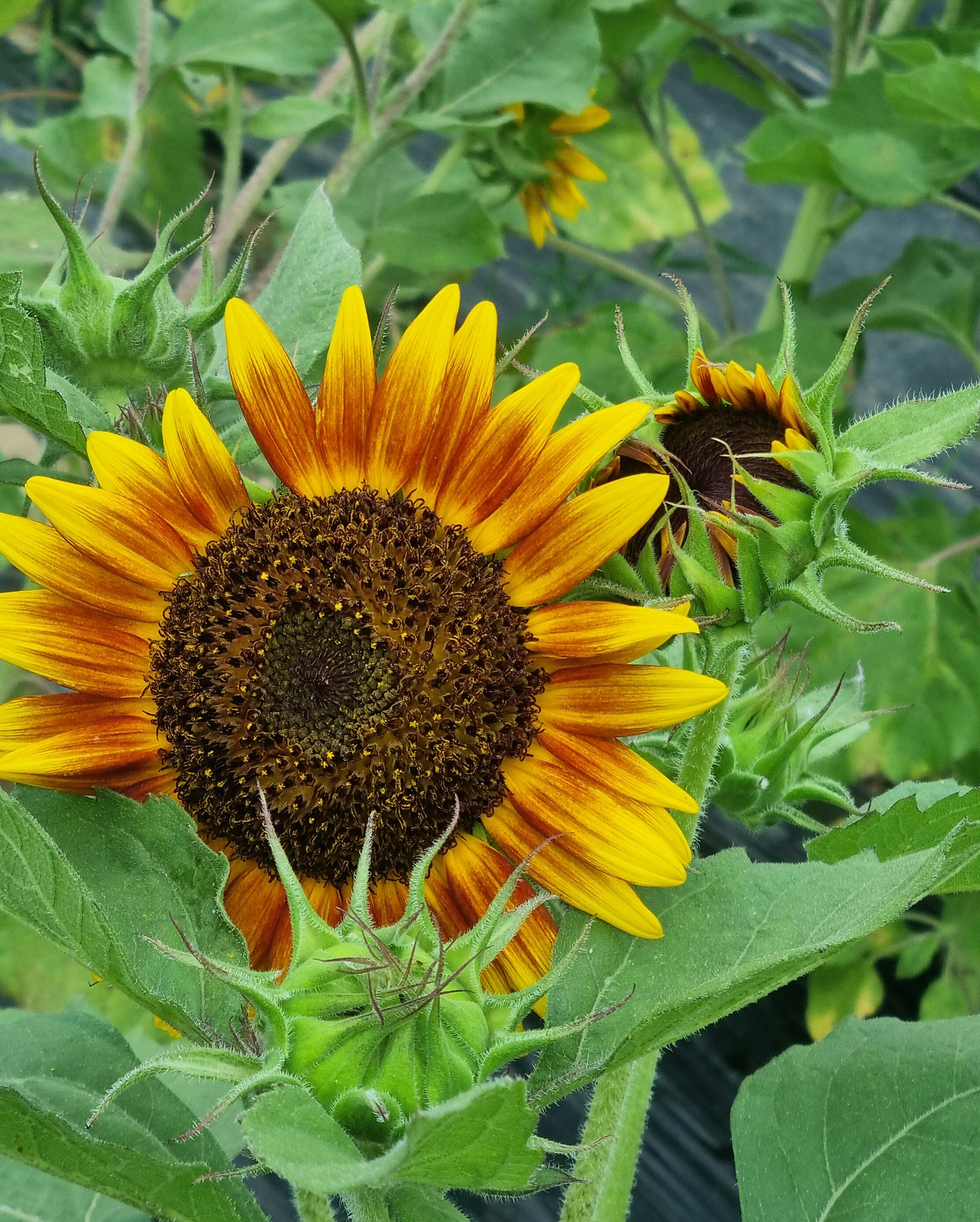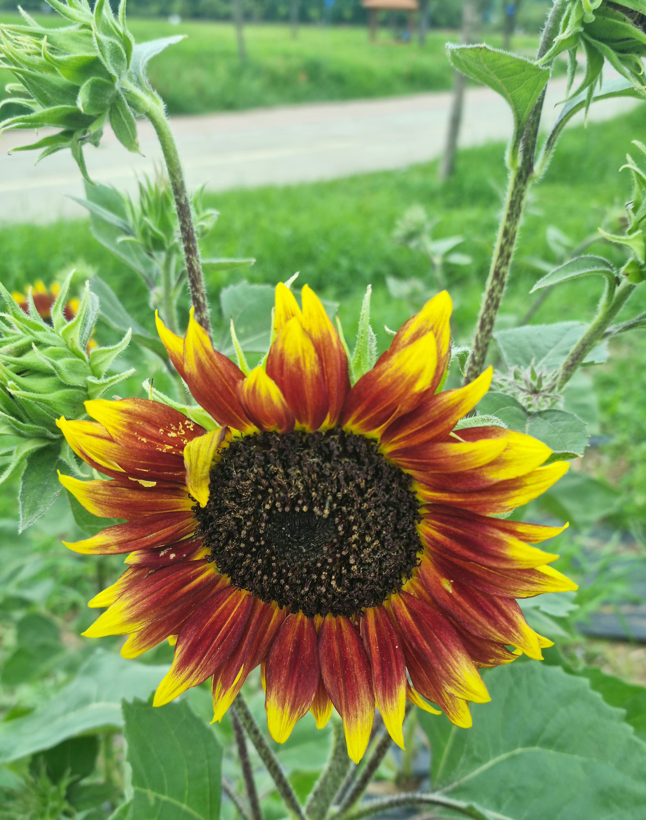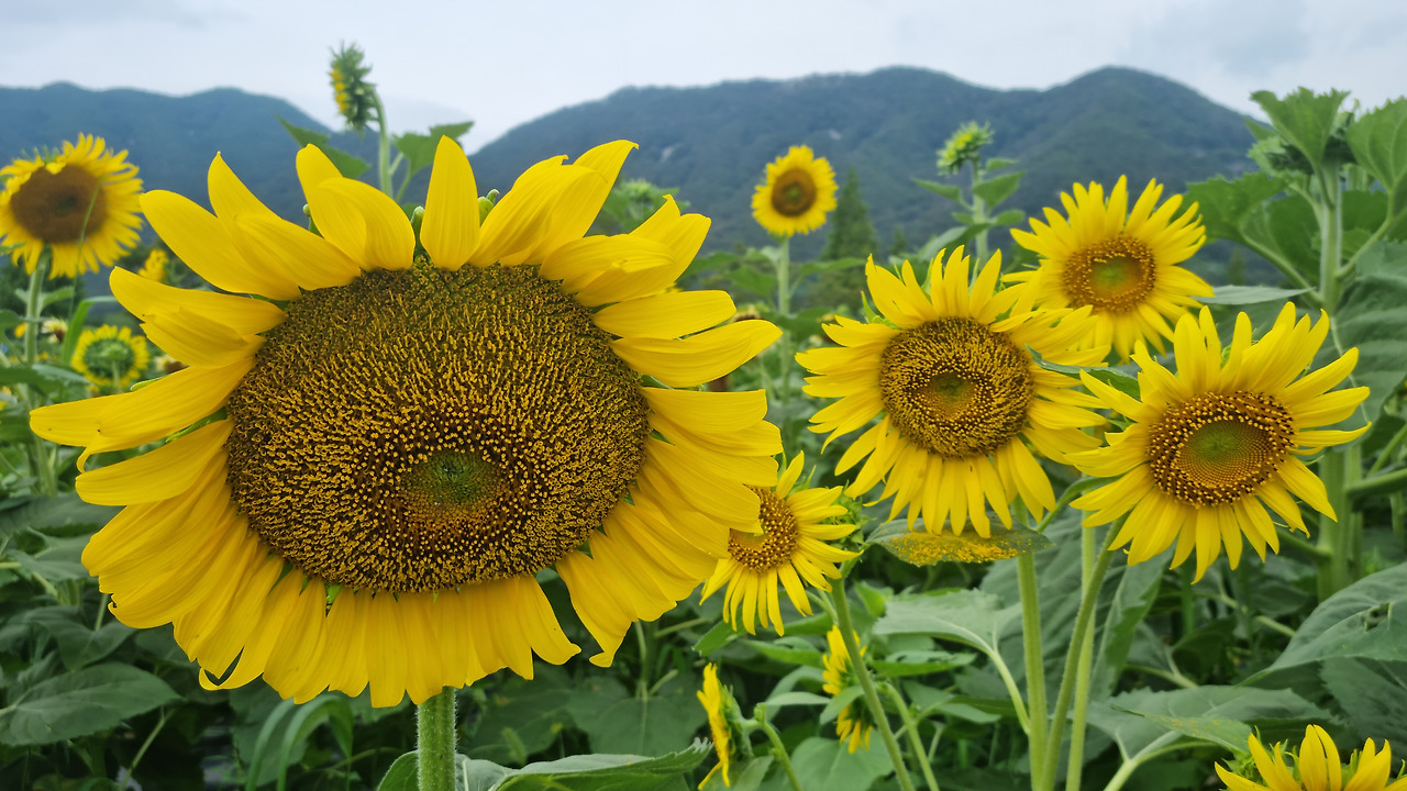 주차장에 주차를 하고 빗방울이 떨어지는 것도 아랑곳없이 핸드폰을 들고 달려갔다. 끝없이 펼쳐진 해바라기 밭에는 다양한 종류의 해바라기가 줄지어 피어 있다. 키를 훨씬 넘게 자란 해바라기도 있고, 작으면서도 씨가 짙은색을 띠는 해바라기도 있다. 노란 잎에 자주색 테두리를 그린 해바라기와 흰색에 가까운 색을 가진 해바라기도 있다. 원 없이 해바라기를 보게 되어 감격스러웠다.