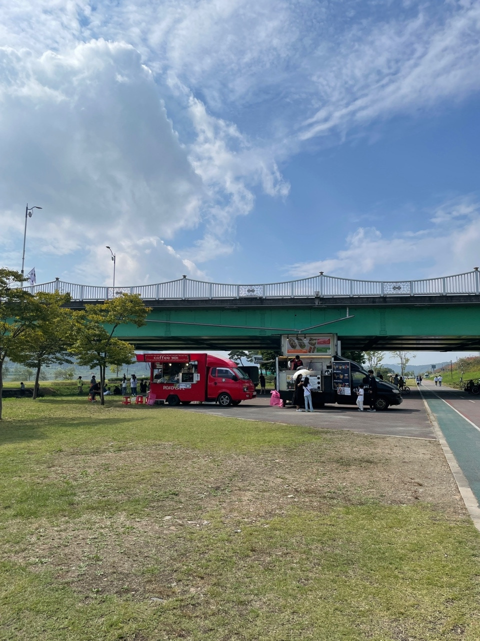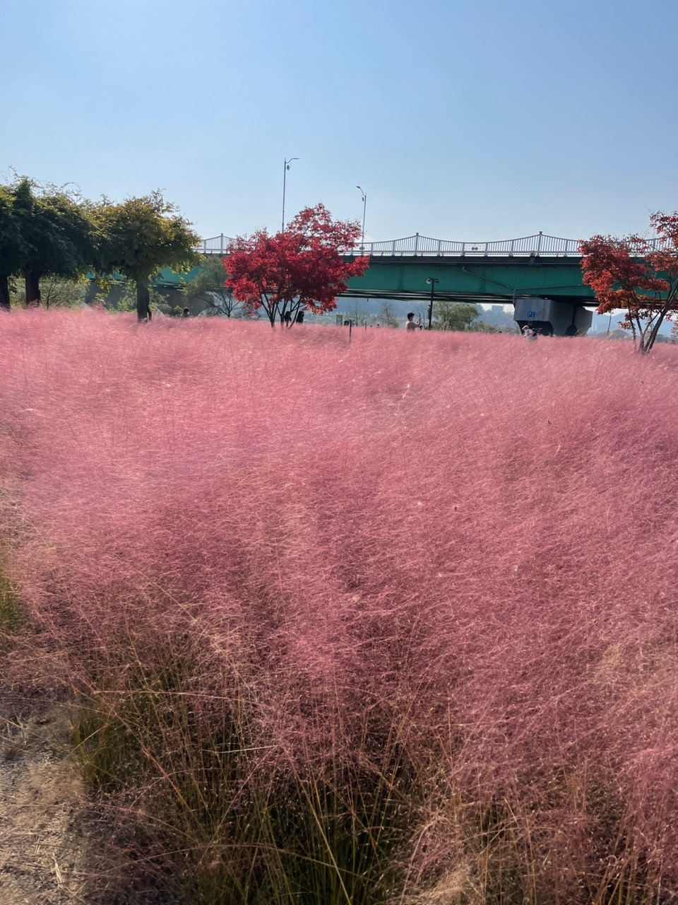 10월 31일 일요일 낮이다. 따뜻함까지 더해진 초가을 날씨는 더할 나위 없이 화창하다. 반팔 티셔츠와 반바지를 입은 10대들 긴팔 셔츠에 긴 바지를 차려입은 대학생들 패딩조끼를 허리춤에 묶어 입은 아이 엄마와 해가 질 때를 대비해서 운동복 바지에 겨울 잠바를 챙겨 입은 할아버지, 4계절 옷차림이 다 있다. 사람들은 강변을 따라 걸으며 빌려주는 자전거를 타기도 하고, 핑크 뮬리 앞에서 번갈아 가면서 사진을 찍어준다. 찡그린 사람은 보이지 않는다. 닭 꼬치를 파는 푸드 트럭과 솜사탕을 기다리는 아이들, 푸근한 날씨에 놀라서 다시 올라온 토끼풀이 반갑기 그지없다. 네 잎 클로버 두 잎을 발견하고 숨죽여 좋아 죽는다.
