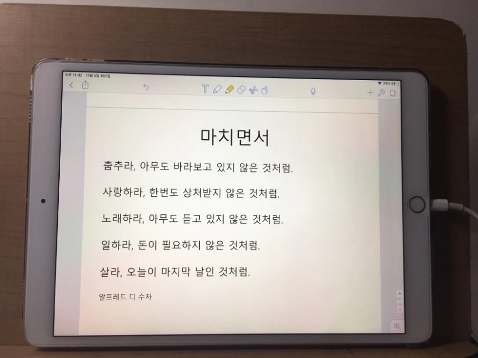 딸아이가 어제저녁 12시가 넘어 카톡을 보낸다. 이번 학기 마지막 PPT 마지막 장이라고. 아마도 본인에게 하고 싶은 얘기일 것이고, 27년 공부만 하는 자신에게 용기를 주고 싶어 되뇌는 글귀였을 것이다. 이 글귀 중"사랑하라' 사랑이 얼마나 하고 싶을까? 딱 사랑하기 좋은 나이에 눈만 뜨면 공부만 징하게 하니 얼마나 자신과의 싸움이 힘들까! 그 나이를 살아본 나는 그토록 열심히 공부한 기억이 없어서 부럽기도 하건만 사랑을 못 해본 딸은 사랑하고 연애하는 친구들이 부러울 수도 있겠다 싶다. 폰을 배 위에 올려놓고 단순 무식하게 생각해본다. 20대 죽어라 탈춤을 추었던 기억도 생각나고, 사는 것이 답답해서 목청 터져라 샤워하면서 노래 불러본 일도 있고, 돈은 늘 필요했기에 돈이 필요하지 않은 것처럼은 아니고 돈이 필요한 사람처럼 열심히 일도 했다. 나를 위해 쓰려고는 이토록 죽기 살기 벌려고 기를 쓰지는 않았을 것이다. 자식이라는 이름이 모질게 살아갈 이유를 정확하고 단호히 알려주었다. 사랑인지 뭔지 모를 콩깍지에 씌어서 지금의 남편과 살고 있다. 이렇게 얘기하면 내가 너무 모질라 보이는데 내 사랑의 확신도 없이 선택한 못 내미라고. 하지만 나의 현명하지 못한 20대 사랑은 한 번에 상처도 싫었고, 남편과의 힘든 사랑을 처음이자 마지막으로 끝내고 싶었다. 그리고 무작정 살았다. 유한한 삶을 알면서도 어쩌면 매일을 마지막 날처럼 산다는 것이 죽음을 준비하고 사는 삶처럼 무섭기도 하고 그렇게까지 철학적으로 생각할 마음이 여유는 더더욱 없었다.