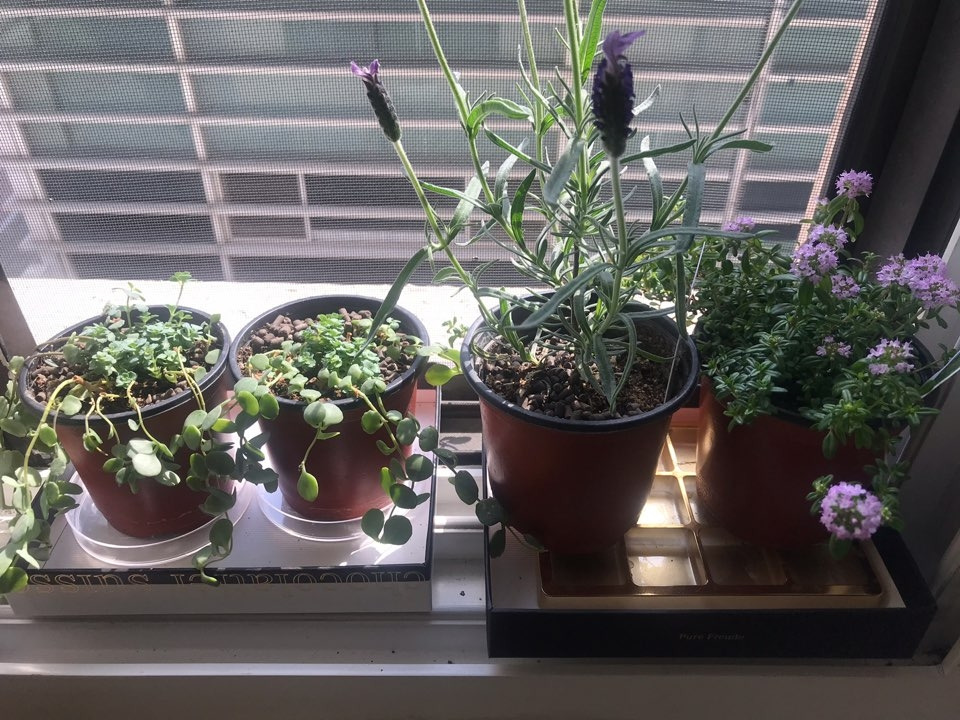 지금 뭘 하면 좋을까 생각하다가 미루고 있던 화분을 들고나가서 길가 큰 나무 밑에 부었다. 엉겨 붙은 뿌리를 고르고 있으니 지나가는 아주머니가 내 머리 위에서 쳐다본다." 한 뿌리 가져가서 심으세요"하고 비닐봉지에 몇 뿌리 챙겨드리니 선물을 드린 듯이 흐뭇하다. 큰 나무 밑과 화분에 한 바가지씩 물을 확 부었다. 넓어진 공간에서 화초가 편안해 보인다. 오랜만에 목욕과 이발도 하니 내 마음도 시원하다. 내친김에 100m 옆에 있는 꽃집으로 걸어가 햇빛을 좋아하며 옹기종기 모여있는 허브 중에서 두 개를 데리고 왔다.
