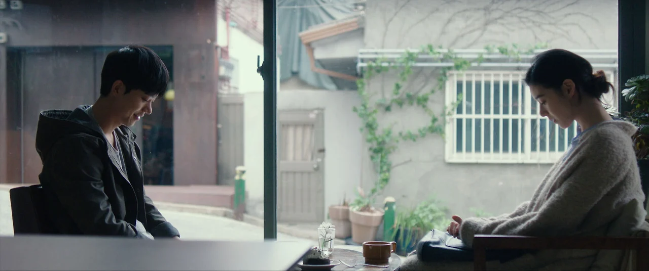 이런 테이블의 의미를 생각해보면 상당히 재미있는 장면을 영화에서 목격할 수 있는데, 바로 두번째로 등장하는 경진과 민호의 씬이다. 경진과 민호는 여타 다른 인물들처럼 테이블을 사이에 두고 대화를 나눈다. 하지만 후반부, 민호는 테이블을 가로질러 경진의 손을 잡는다. 그리고 그것은 두 사람 사이의 감정을 폭발시키는 불씨가 된다. 경진과 민호 사이에 있는 알 수 없는 간극이 민호가 테이블을 가로지른 순간 메워진 셈이다.