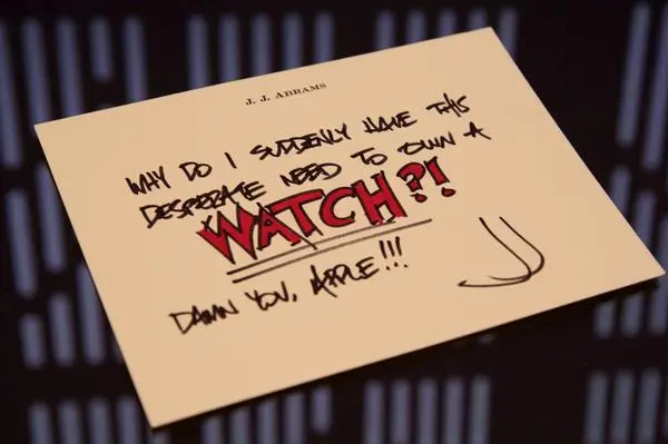 발표 전 언론의 호들갑(훔친 부품 사진과 상상한 제품의 실물 크기 모형 등) 대응법을 배운 점이 있다면, 에이브람스는 그런 현상을 즐길 줄 안다는 점이다. 캘리포니아의 한 이벤트에서 그는 #AppleWatch 해시태그를 붙여서 트위터에 이미지를 하나 올렸다. 그 이미지는 손수 쓴 카드였다. (“Why do I suddenly have this desperate need to own a WATCH? Damn you, Apple!!!”) 그런데 이 사진을 자세히 보면 새로운 데스 스타의 내부를 얼핏 알아볼 수 있게 돼 있다.