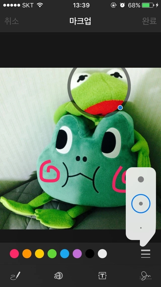 첨부한 사진을 길게 누르면 선택 사항 팝업 메뉴가 표시 되는데 오른쪽 화살표를 탭 하고 "마크업"을 선택합니다.