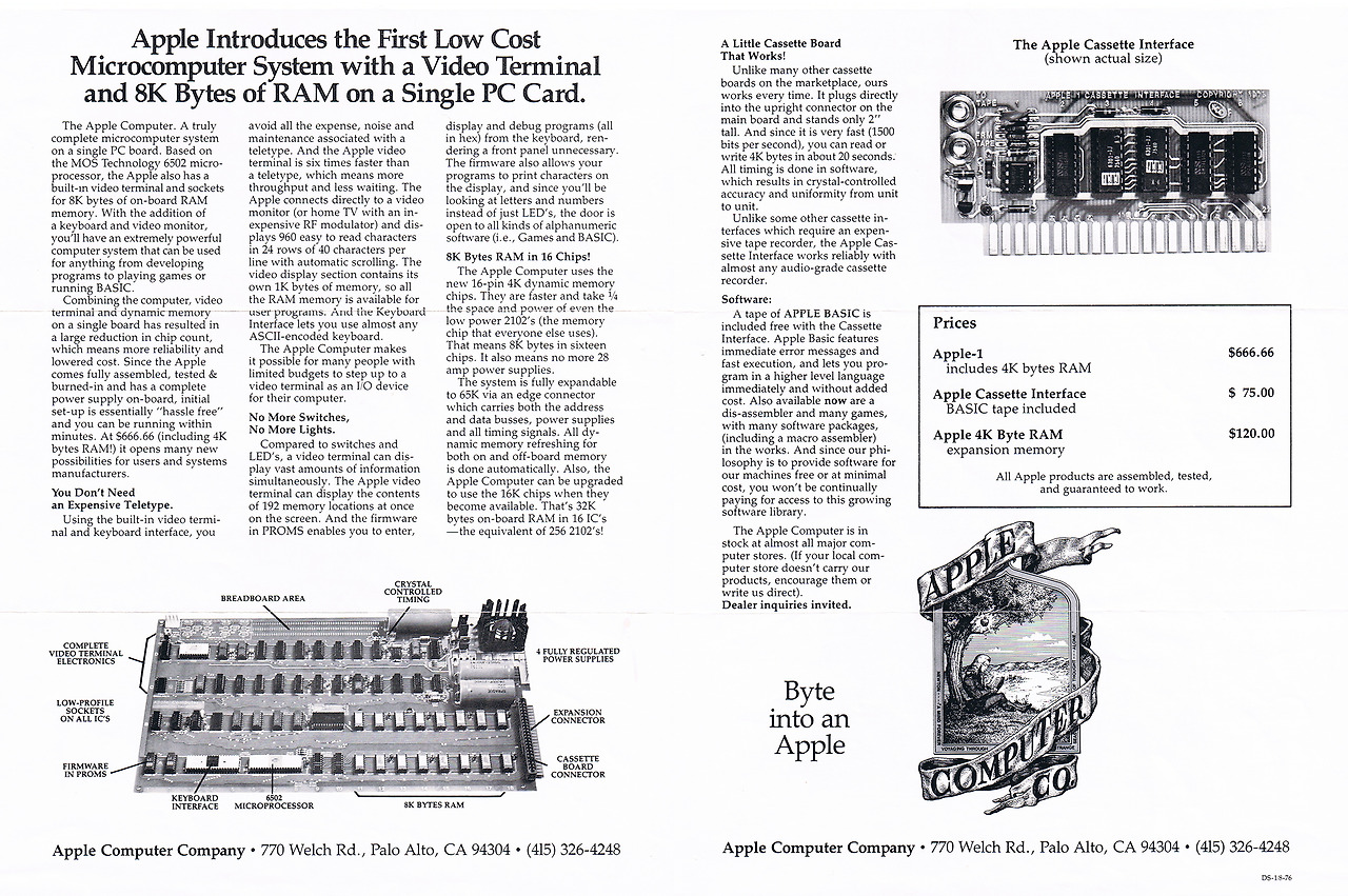 6월 레지스 맥케나(Regis McKenna) 광고 회사에 애플 컴퓨터 광고를 맡기자, 이 컴퓨터에 대한 일반인들의 관심이 모아지기 시작했습니다. 그 후 추종자들에 의해 Apple I 보드 50개는 바이트 컴퓨터 상가에서 컴퓨터 및 전자광들에게 $666.66에 판매되기 시작하면서 기대했던 것 이상의 판매고를 올리기 시작했습니다.