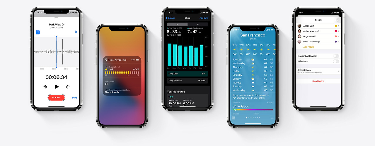 날씨, 시계, 캘린더, 메모, 지도, 피트니스, 사진, 미리 알림, 주식, 음악, 팟캐스트, 팁, 배터리, 스크린 타임, 파일, Siri 제안, 단축어, 앱 제안 등 Apple 앱의 위젯들이 새롭게 디자인되었습니다.