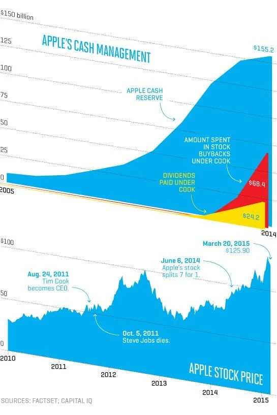 사실 쿡 체제의 애플이 근본적으로 건전한지에 대한 논쟁은 이제 거의 없다. 잡스가 사망한 후 애플 주가는 주식 분할 때의 54달러에서 최근 126달러로 치솟았으며 시가 총액으로 환산하면 7천억 달러를 훌쩍 넘어섰다. 시가 총액이 7천억 달러를 넘은 기업은 애플이 최초다. 실제로 애플의 시가 총액은 엑손 모빌이나 마이크로소프트의 두 배 이상이며, 애플은 2010년 이래 현금 보유고를 3배 이상 늘려 1,500억 달러 이상 확보했다(애플은 주식 배당 및 환매로 총 926억 달러나 사용했으며 잡스가 주주에게 배당금을 지급하는 데 인색했다는 점을 감안하면 엄청난 성과이다).