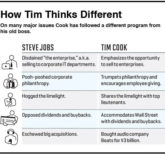 쿡은 사회적인 문제에 관한 의견뿐 아니라 기타 여러 가지 방식이 잡스와 달랐다. 1998년 컴팩 컴퓨터에서 애플로 이직한 쿡은 경영학을 전공했으며 커리어 초기를 IBM에서 보냈다. 다시 말해 애플에서 쿡은 임원들이 말하는 제품 개발, 디자인, 마케팅과 같은 중요한 분야의 ‘핵심 전문가(subject-matter expert)’가아니었다는 의미다. 그는 잡스처럼 사람을 다루는 데 능한 인물보다는 자기 선수를 전적으로 믿는 감독에 가까운 인물이었다.