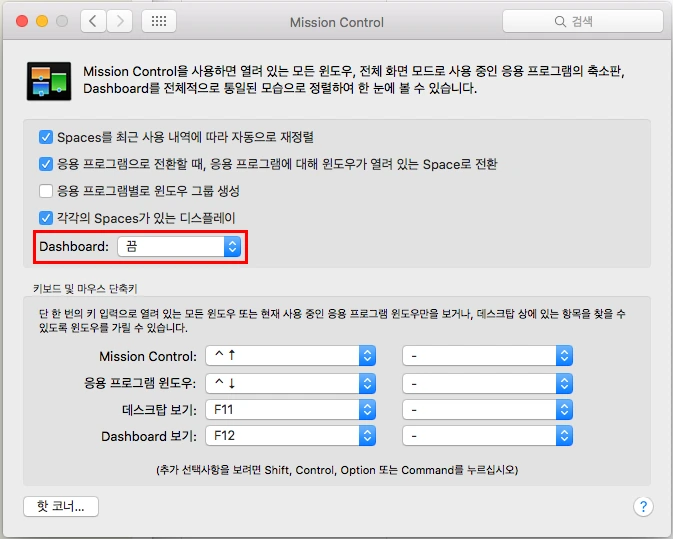 설정 > Mission Control에서 "Dashboard"를 변경할 수 있습니다.