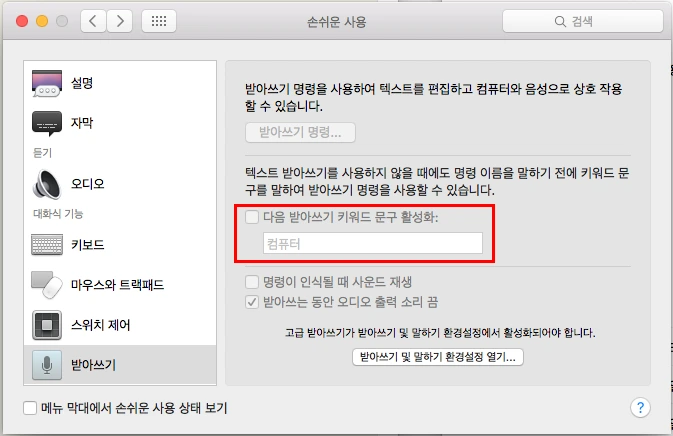 시스템 환경설정 > 손쉬운 사용 > 받아쓰기에서 특정 키워드를 말하여 받아쓰기 명령을 사용할 수 있게 되었습니다. 기본적으로 "컴퓨터"가 등록되어 있습니다.