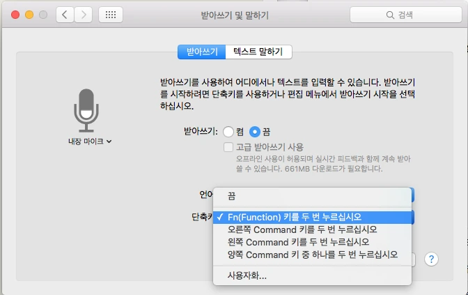 Command키를 사용하여 "받아쓰기 및 말하기"의 기능을 실행할 수 있습니다. 시스템 환경설정 > 받아쓰기 및 말하기 에서 "단축키" 항목에서 변경할 수 있습니다.