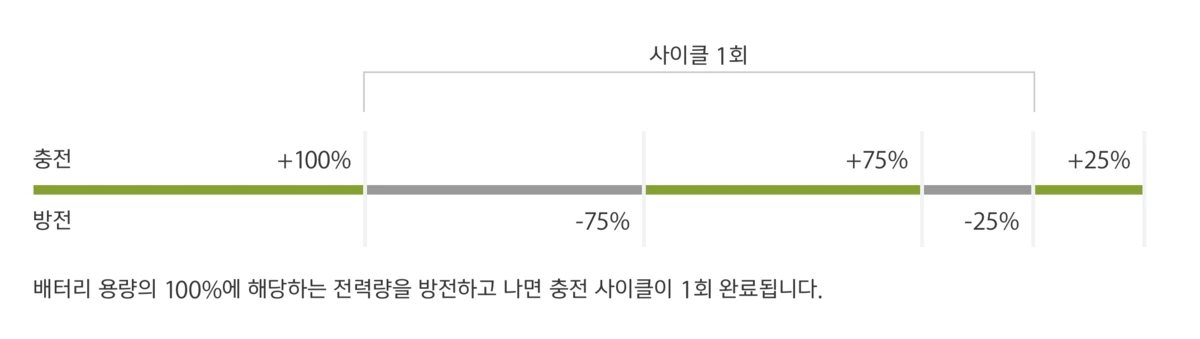 예를 들어 하루에 노트북 배터리 충전 량의 절반을 사용한 후 이를 다시 완전히 충전하고, 그 다음날에도 이를 반복한다면, 충전 사이클은 2회가 아닌 1회가 됩니다.