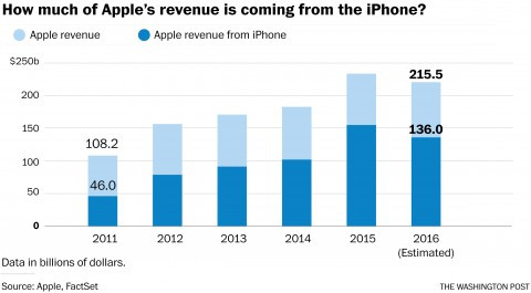 그러나 아이폰은 또한 최근 실망의 원천이기도 했다. 가장 최근 분기 동안 아이폰 판매량은 1년 전에 비해 23% 감소했으며, 전체 매출에 대한 기여도 14.6% 떨어졌다. 13년 동안의 성장 끝에 판매가 감소가 연속 두 분기 째 일어났다.