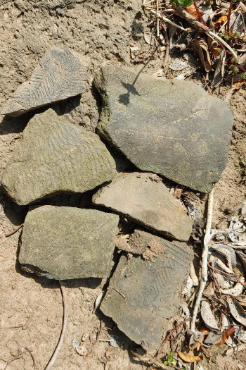 한참을 과수원을 거닐어본다. 설마 기와나 토기 등의 흔적을 찾을 수 있을까 하는 기대감으로 바닥에 뒹구는 돌들을 유심히 들여다본다. 역시 찾지 못하고 실망감에 과수원을 나서는 초입에 의심스러운 조각이 있다. 하나 보이기 시작하니 제법 연이어 눈에 잡히는 흔적, 반갑다. 평범한 돌일까, 내가 찾던 와편일까 자세히 보니 물결 모양 무늬가 희미하게 남아있다. 빗살무늬도 보인다. 아마도 나처럼 이곳을 찾아 같은 흔적을 찾던 앞선 이의 공력이 들어있음이 아닐까 하는 생각을 해본다. 이 몇 점의 조각이 아니었다면 흔적이라고 할 만한 것을 찾기 힘들 터였다.