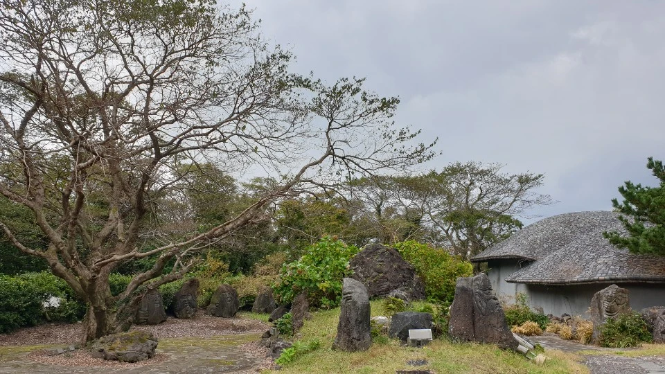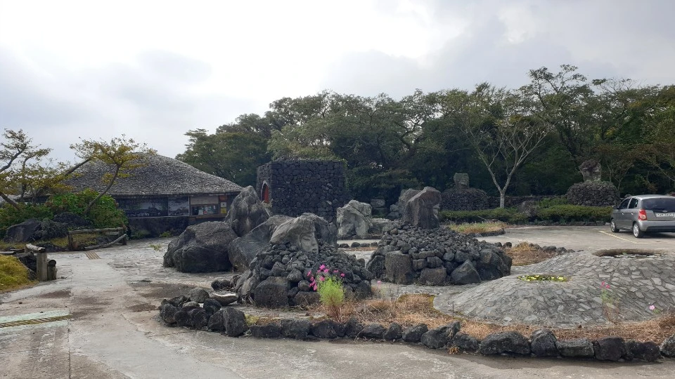 곶자왈로 들어서는 입구에는 제주 초가와 오름의 모양을 따온 전시관이 낮게 줄지어 있다. 예전에 방문했을 때는 이곳이 ‘기메지전’이라는 전시관이었던 기억이 있다. ‘기메’는 제주에서 무속의식을 치를 때 쓰는 종이로, 다양한 형태로 오려서 굿을 할 때 대나무 끝에 매달아 신단 주위에 세워두거나 무당이 손에 들고 춤을 추기도 했다. 한 마디로 신의 강림을 상징한다고 볼 수 있다. ‘지전’은 종이돈으로 현금 대신 신에게 올리는 돈으로 저승에서 망자가 사용할 저승 화폐를 상징화한 무구이다. 기메지전 외에도 굿할 때 쓰는 도구들을 전시한 ‘무구전’ 공간도 있었는데 지금은 문을 걸어 잠가 살펴볼 수가 없다.