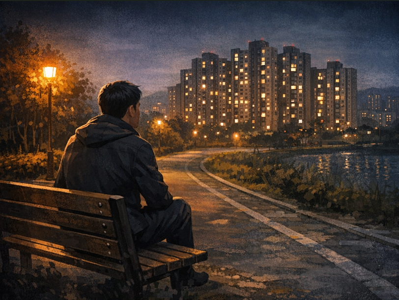 저녁을 먹은 후 반듯하게 조성된 산책길을 걷다가 멀리 솟아 있는 아파트를 바라본다. 듬성듬성 켜져 있는 창가를 바라보니 나도 단란한 가정을 꾸려 따뜻한 창을 가지고 있다는 것에 새삼 감사하다. 젊은 시절에 저 아파트를 짓는 공사 현장에서 일했던 기억이 떠오른다. 아파트를 지날 때마다 아내에게 내가 지었다며 이야기를 꺼내면 또 그 이야기냐며 핀잔을 주던 대화가 떠오른다. 벤치에 앉아 상념에 잠기자 아파트 창문의 빛 속으로 서서히 빨려 들어간다.