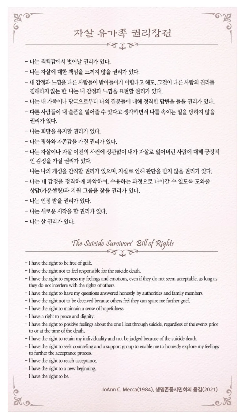 상담샘 : 대단한 건 아니고 지금 세상엔 없지만 앞으로 생길 자살 유가족 권리장전이야. 접어두었다가 힘들 때마다 꺼내 읽으면 도움이 될 거야.