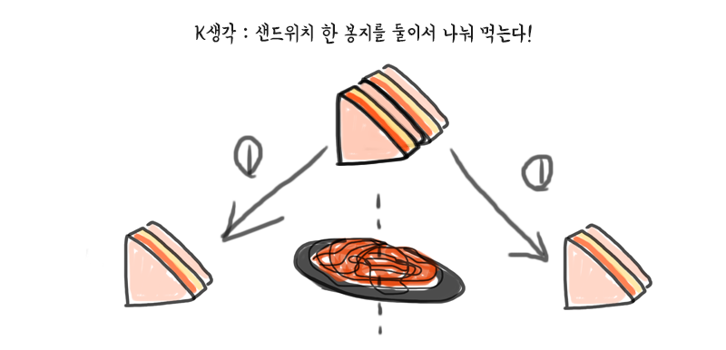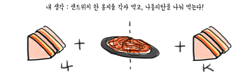 K는 파스타 한 접시와, 샌드위치 하나를 사서 반반씩 먹으려는 생각이었던 것이다.