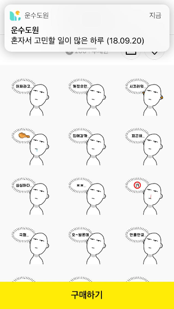 매일 아침 출근길 버스안에서 이모티콘 숍을 들리는 것은 하나의 의식이 되어버린지 오래. 서너개씩 업데이트 되는 이모티콘 중 마음에 드는 것이 있을 때면 상세 보기 탭으로 들어가 한번 훑어보기. 사랑에 빠지는데는 0.2초면 된다고 했던가. 이모티콘을 구매하는 과정도 사랑에 빠지는 것과 크게 다르지않다. 썸네일과 눈맞춤 찌릿, 이끌려 들어간 상세보기 페이지에서의 탐색전, 모션은 얼마나 쫄깃한지 체크, 체크, 체크. 이 모든 과정이 만족스러운 경우 다시 한번 꼼꼼히 디자인과 모션을 살펴보고 고심하기. 바로 구매하기로 이어지는 경우는 굉장히 드물다. 갖고 있는 이모티콘도 원체 많거니와 그만큼 마음을 사로잡는 이모티콘은 의외로 없기 때문.