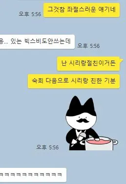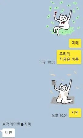 비꼬는 독설을 내뱉는 이모티콘들은 재미있다. 그러나 단점이 한가지 있는데, 나에겐 생각보다 쓸 수있는 기회가 많이 없었다는 점이다.(내가 예쁜말만 쓰는건 아닌데도.. 몬가.. 몬가 그런것이다..! 아님 내가 너무 투머치 자극적인 임티만 봤나... 막말 임티 쓰고 집에 가서 막.. 아까 기분나빴어 혹시? 미안해..ㅠㅠ 할거같고 막!) 기껏 돈을 들여 샀으니 아까운마음에 막 써보자니 사람들 기분을 망쳐버릴 것 같은 것. 그렇게 충동적으로 구매해 [숨기기]탭에 들어간 이모티콘이 두어개. 이같은 경험을 하고 나니 막말류의 개그 이모티콘의 구매버튼은 더이상 누르지 않게 됐다. 볼 땐 너무 웃기지만, 막상 쓸데가 없으니 이 얼마나 아까운 일인가. 이후 이런 이모티콘은 가차없이 쇼핑카트에서 OUT.