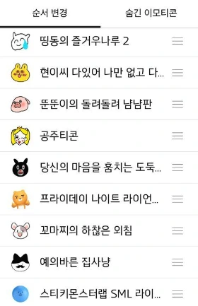 어떤 이모티콘은 새로 업데이트 되자마자 첫눈에 반해 [구매하기]를 하기도 하지만, 어떤 이모티콘은 몇주에 걸친 새로운 이모티콘과의 이상형 토너먼트를 통해 [구매하기]가 결정되기도 한다. 그렇게 사모은 이모티콘만 스무개는 족히 넘을 것이다. 사실 세어보지 않아서 정확한 갯수는 모르지만... 아니다. 다시 생각해봐도 20개는 가뿐히 넘는다.