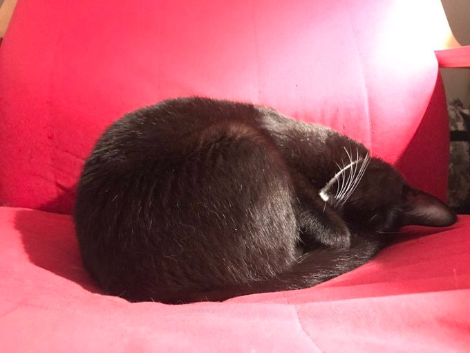 보통 숙희는 보통 내 머리 맡에 둔 소파 모양의 스크래처 위에서 자거나, 빨간색 이케아 소파 위에 푹 파묻혀 자거나, 때로는 현관 앞 러그 위에서 잔다.