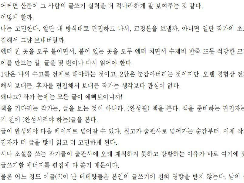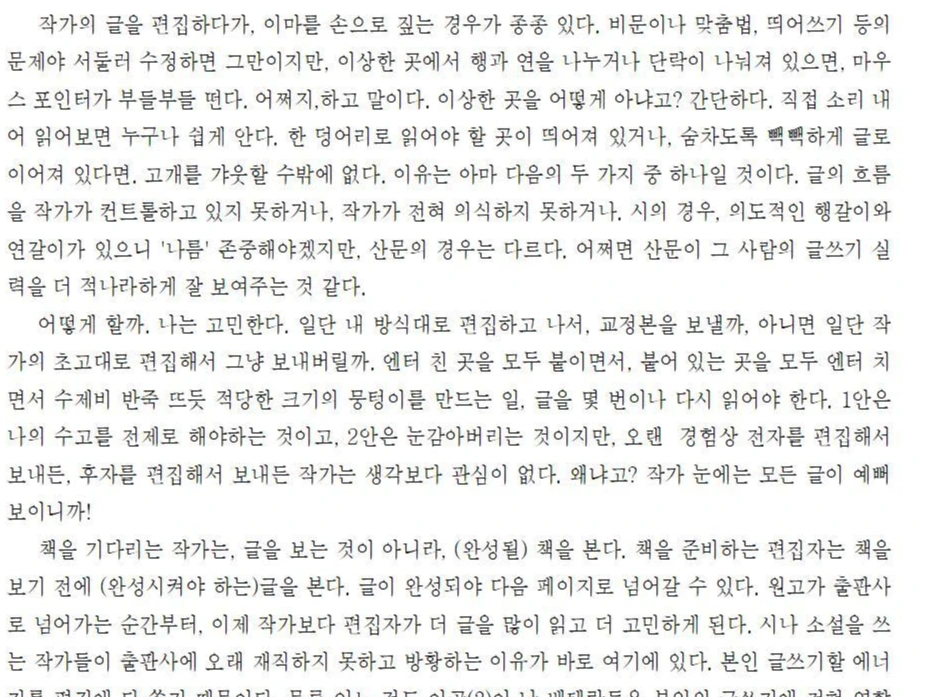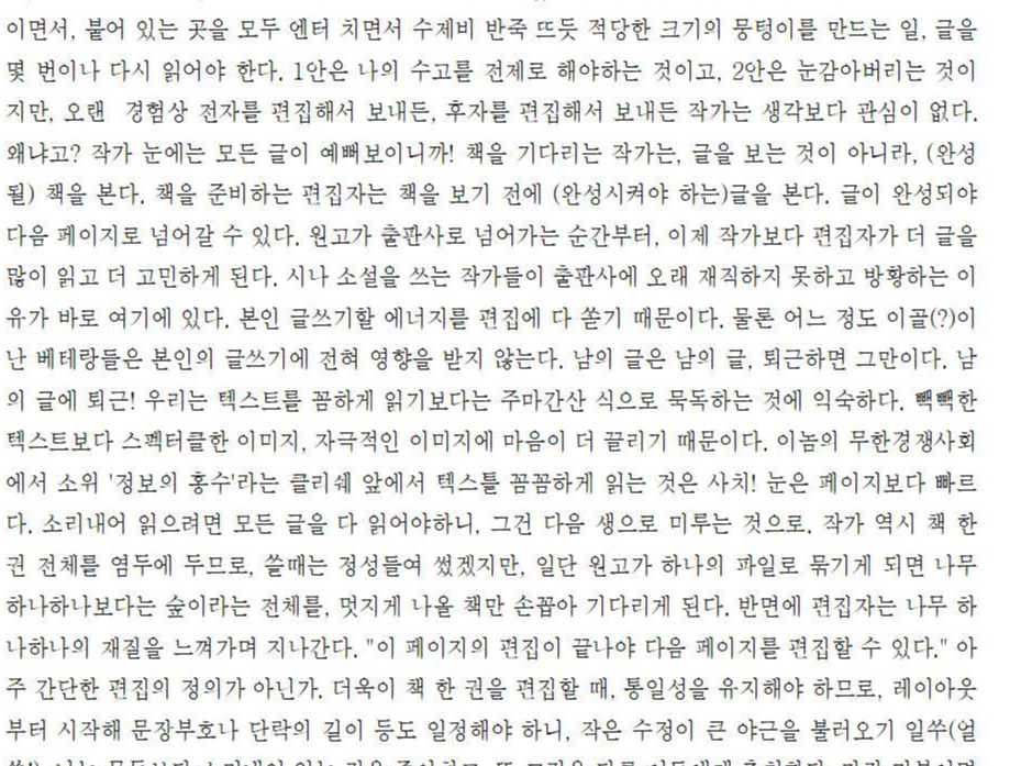 어떻게 할까. 나는 고민한다. 일단 내 방식대로 편집하고 나서, 교정본을 보낼까, 아니면 일단 작가의 초고대로 편집해서 그냥 보내버릴까. 엔터 친 곳을 모두 붙이면서, 붙어 있는 곳을 모두 엔터 치면서 수제비 반죽 뜨듯 적당한 크기의 뭉텅이를 만드는 일, 글을 몇 번이나 다시 읽어야 한다. 1안은 나의 수고를 전제로 해야 하는 것이고, 2안은 눈감아버리는 것이지만, 오랜 경험상 전자를 편집해서 보내든, 후자를 편집해서 보내든 작가는 생각보다 관심이 없다. 왜냐고? 작가 눈에는 모든 글이 예뻐 보이니까!