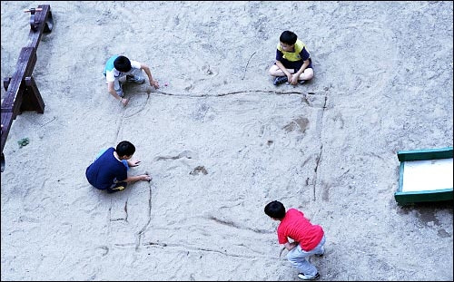 땅따먹기 놀이. 돌을 최대한 멀리 튕기되, 딱 3번 만에 자기 집 안으로 들어와야 한다. 2번도 안 되고 4번도 안 된다. (이미지-한겨례신문 2006. 9.22)