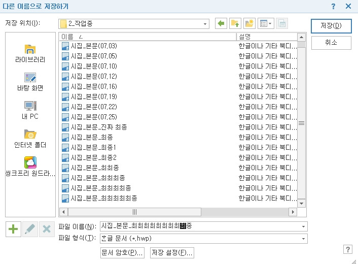 그리고 여기에 하나 더. '다른 이름으로 저장하기'(알트브이, Alt+V)가 있다. 알트브이는 작업물의 이름을 바꿔서 저장하는 명령어이다. 하나의 작업물은 하루아침에 끝나는 것이 아니므로, 날짜별로, 특이사항별로 저장하기 위한 것인데, 이것도 매우 중요. 아무 생각 없이 이미 작업이 완료된 작업물과 그 이전 작업물을 혼동하여 예전 작업물을 열어 작업도 하지 않은 채 완료된 작업물 이름으로 저장하는 순간, 또다시 지옥문이 열린다. 야근이 문제가 아니다. 나 자신을 수없이 자책하고 원망하여 마침내 자학에 이르게 된다! 그리고 너무 많은 알트에스가 존재하면, 그것도 문제. 무엇이 마지막 작업물일까. 파일명을 보면 그 작업이 얼마나 고된 작업이었는지 알 수 있다. 최최최최최최최최최최최종. "나의 가장 나아종에 지닌 것도 오직 이 뿐"(김현승, <눈물>)이었으면 좋으련만. 최종은 최종까지 최종이 아니다.