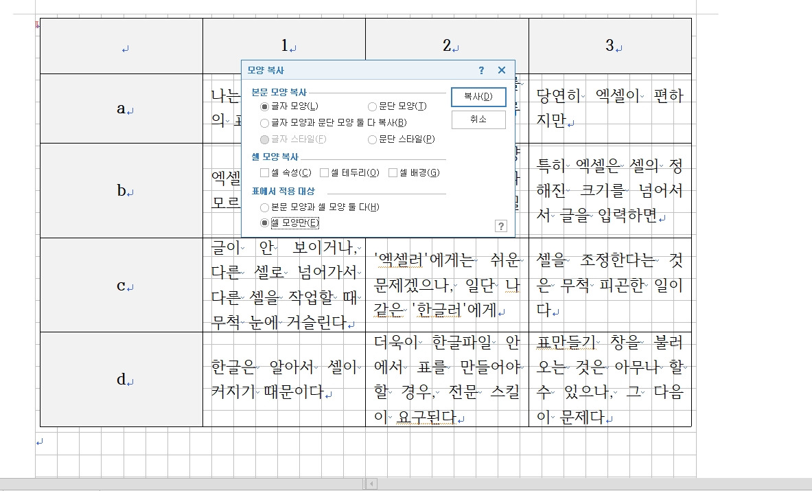 물론, [표마당]의 샘플을 가져와 그대로 작업하면 되나, 부득불 임의로 몇 가지의 기능만 써야 할 때가 있다. 각 잡고 써야 하는 논문이나 기획서에 애교 넘치는 표를 넣을 수는 없으니까 말이다. F5로 셀을 설정하여 텍스트 스타일을 먹이고, 셀의 테두리를 변경하며 색을 넣을 수 있다면, 여기서 tip 하나 추가요! 바로 Alt+C(모양복사)라는 기능! 이것은 일반 텍스트에도 적용된다. 스타일이 그대로 복사되는 기능이다. 중요한 것은 처음 복사할 대상은 커서만 위치시키고 Alt+C를 눌러야 하고, 다음 복사할 대상은 드래그를 하거나 F5 등으로 복수의 대상을 선택한 후에 Alt+C를 눌러야 한다. 셀에서는 속성과 배경 등이 복사될 수 있으며, 본문의 글씨와 셀을 모두 복사하거나 셀만 복사할 수도 있으니, 꼭 사용해보시길. 일일이 셀을 눌러가며 설정할 필요가 없다. 수고스럽겠지만, 셀을 괴롭힐수록 표는 점점 예뻐진다.