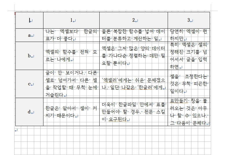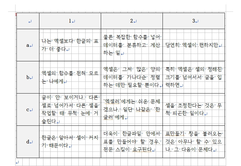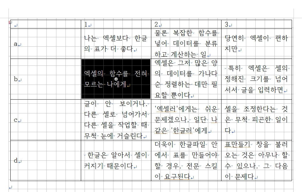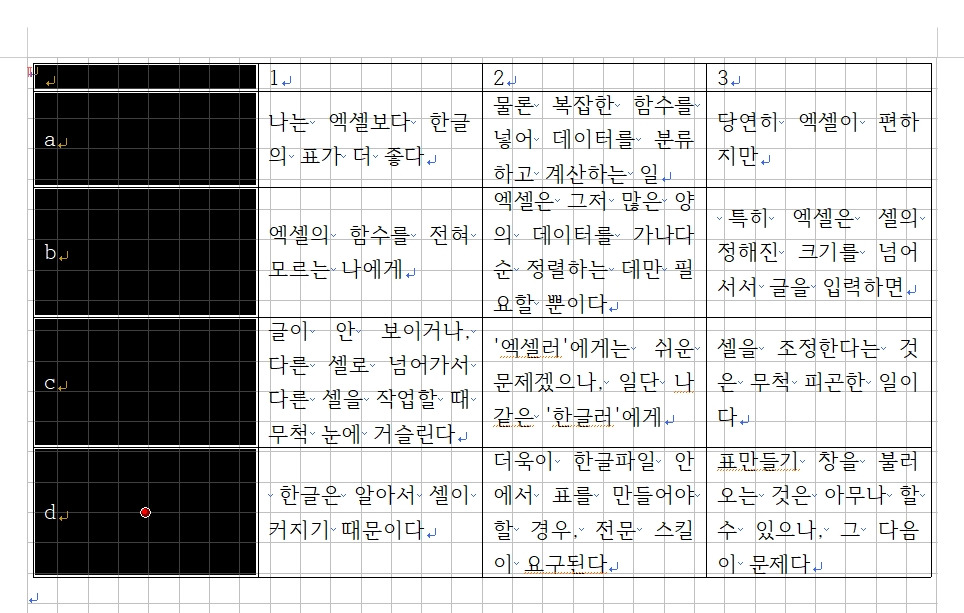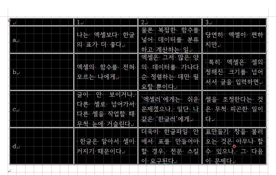 나는 엑셀보다 한글의 표가 더 좋다. 물론 복잡한 함수를 넣어 데이터를 분류하고 계산하는 일에는 당연히 엑셀이 편하지만, 엑셀의 함수를 전혀 모르는 나에게(알고 싶지 않다. 마! 난 문과다!) 엑셀은 그저 많은 양의 데이터를 가나다순 정렬하는 데만 필요할 뿐이다. 특히 엑셀은 셀의 정해진 크기를 넘어서서 글을 입력하면 글이 안 보이거나, 다른 셀로 넘어가서 다른 셀을 작업할 때 무척 눈에 거슬린다. '엑셀러'에게는 쉬운 문제겠으나, 일단 나 같은 '한글러'에게 셀을 조정한다는 것은 무척 피곤한 일이다. 한글은 알아서 셀이 커지기 때문이다. 그리고 한글의 표도 엑셀처럼 수치의 합계, 정렬 등도 가능하니, 한글을 쓸 수밖에. 물론 한글파일 안에서 표를 만들어야 할 경우, 전문 스킬이 요구된다. 메뉴바-[입력]-[표 만들기]의 순(단축키는 Ctrl+N+T)으로 일단, 표만들기 창을 불러오는 것은 아무나 할 수 있으나, 그다음이 문제다.