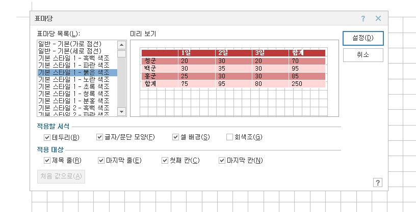 [표마당]의 [적용할 서식] 및 [적용 대상]의 여러 메뉴도 하나씩 눌러보시라. 당신이 원하는 표를 클릭 단 한 번으로! 이미 이것을 알려드린 것만으로도 당신은 표만들기 '왕초보'를 지나 고수의 영역에 진입하셨다. 이것으로 이 글을 끝내도 부족함 없겠으나, 이제 시작이다. 이 정도는 맛보기에 불과하다!!(자신감 뿜뿜!)