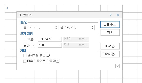 줄/칸을 지정하고 [만들기]를 클릭하면 표가 만들어진다. 당연히 표도 [글자처럼 취급]을 누르고 만들면 글밥을 위아래로 밀 수 있다. 글밥과 어울리고 싶으면 그대로 두면 되고, [마우스 끌기로 만들기]를 체크하고 표를 만들면, 마우스 드래그 크기에 따라 표가 만들어진다. [표마당]과 [표속성]도 눌러보시라. [표마당]은 말 그대로 신세계!! 표로 기교 좀 부리고 싶다면 [표마당]을 적극 이용해보실 것!
