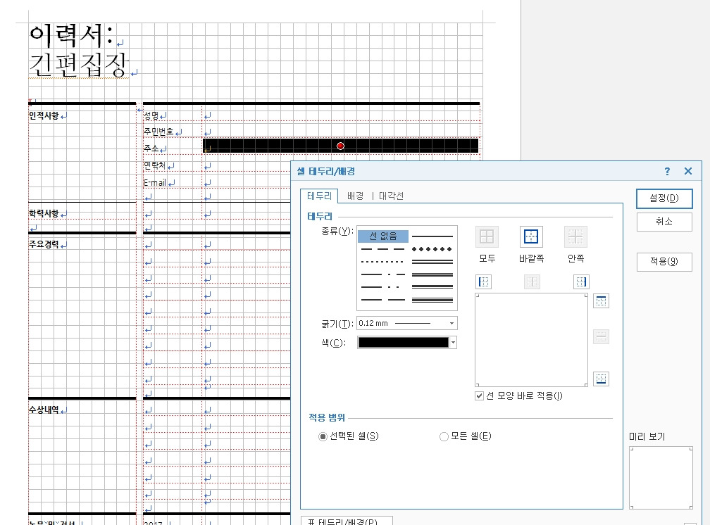 내가 여기저기 제출할 때 쓰는 이력서 양식이다. 빨간색의 [선 없음]으로 인해 이력서가 더 고급져 보인다. 나도 고급지고 싶다!